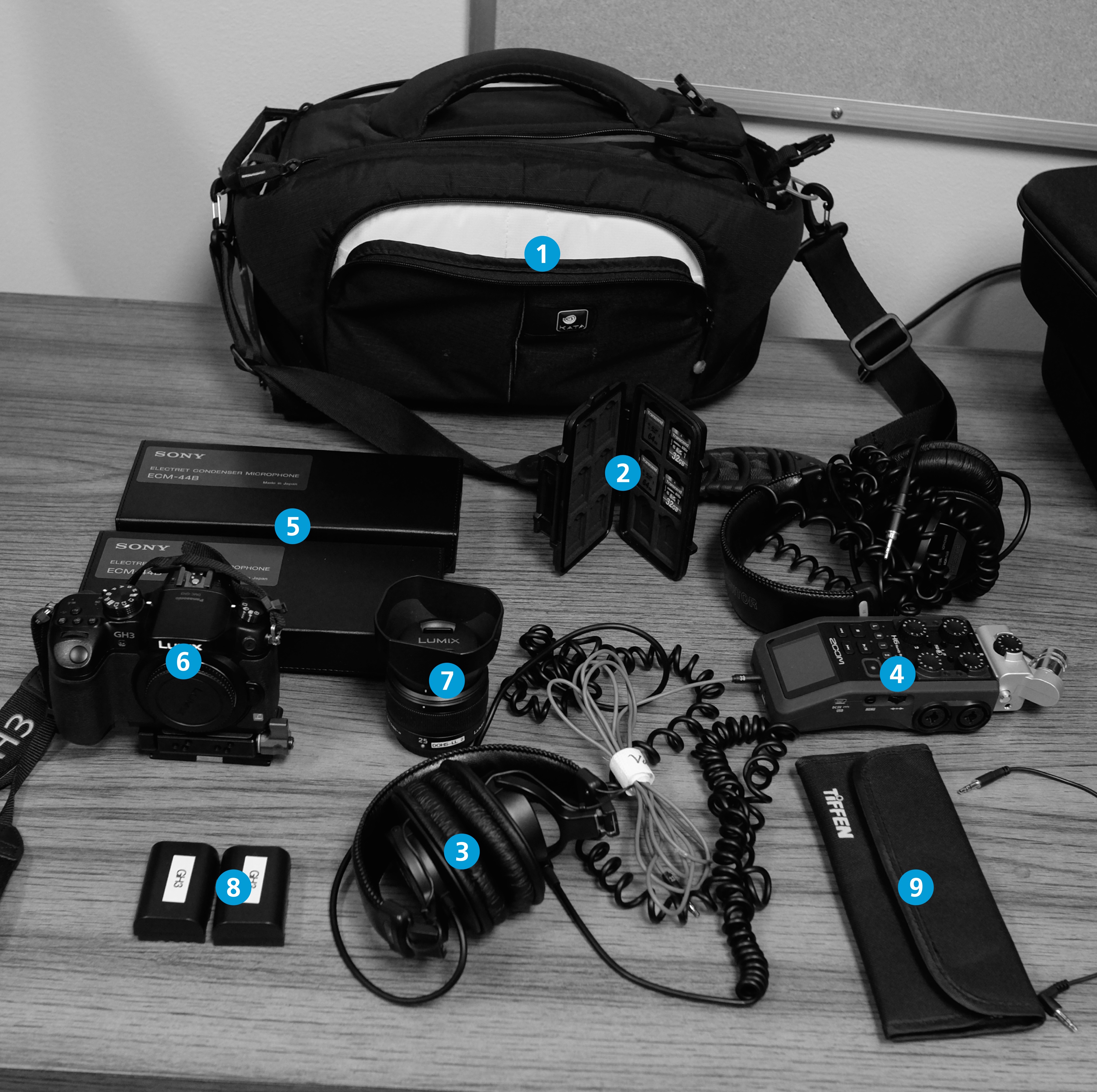 - Panasonic 12-35/2.8 – This is a quality zoom lens with an active M4/3 mount and fixed maximum 2.8 aperture throughout its focal range. It is also an image stabilized lens, which means it is the best choice the studio currently owns for shooting hand-held and B-roll. Has a lens hood attached and accepts the 62mm Tiffen neutral density filters pictured in the adjacent wallet.