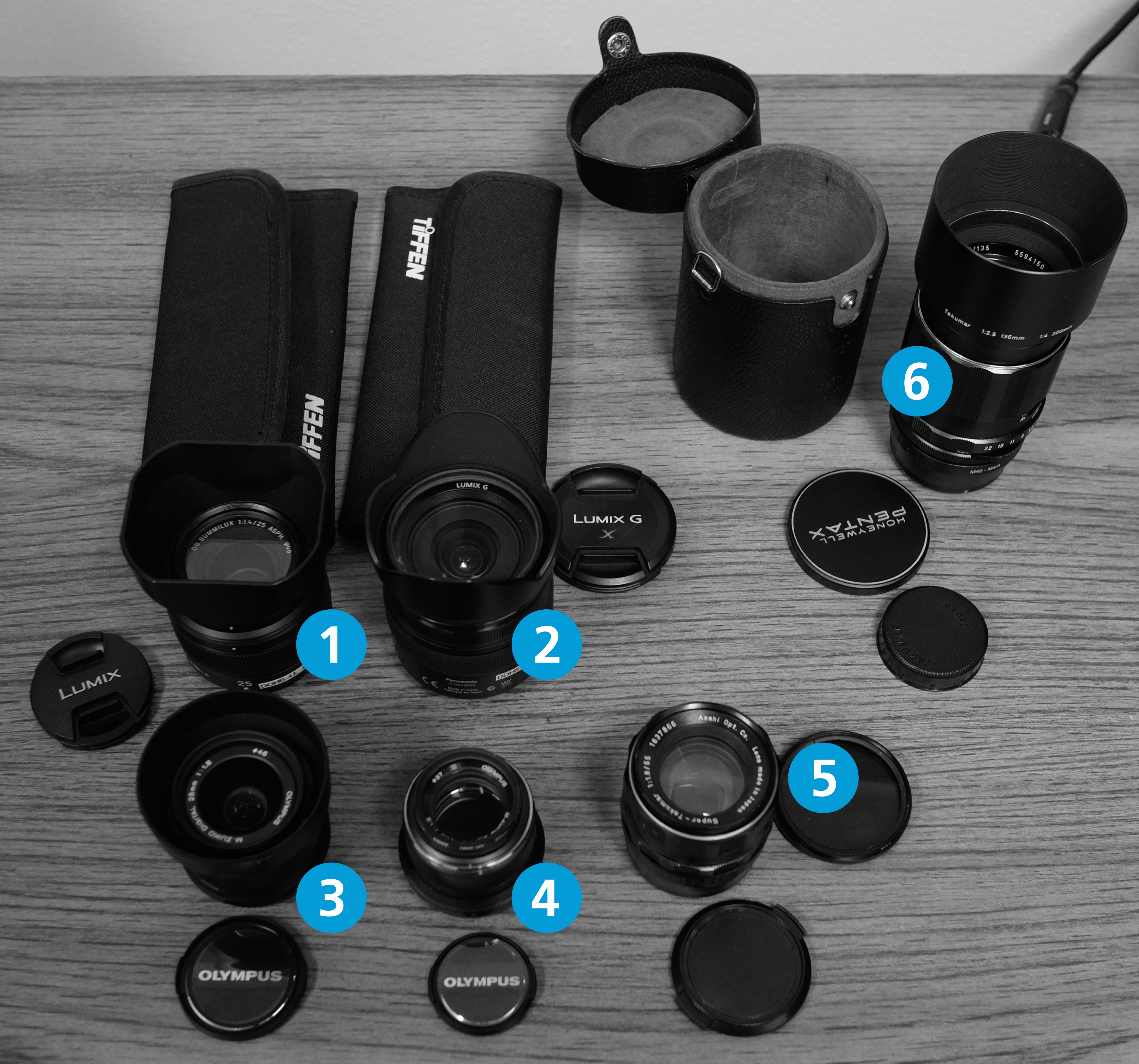 - Leica/Panasonic 25mm/1.4 – This is fast, wide to medium focal length high-quality prime lens with an active M4/3 mount. Has a lens hood attached, and accepts the 46mm Tiffen neutral density filters pictured in the adjacent wallet.