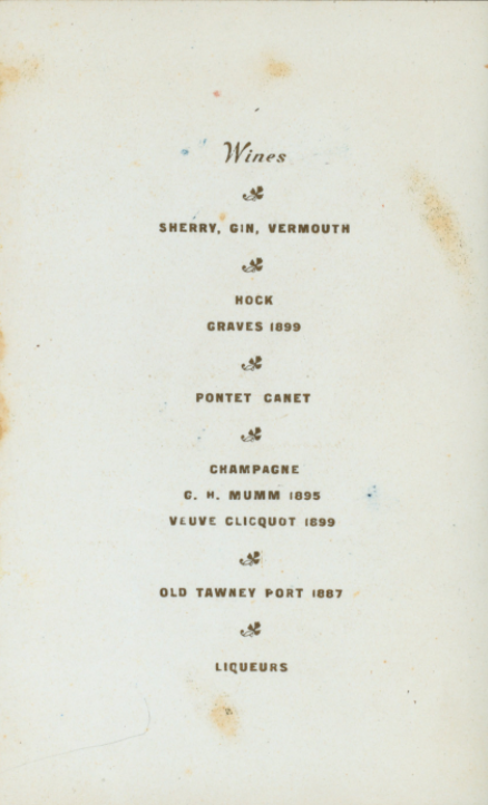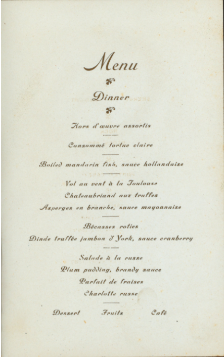 Beyond this dinner being for the Vice President of the Commercial Cable Company, the food that was actually served is also reflective of Shanghai at the start of the 20th century. The alcohol served is all clearly imported from foreign sources, and, again, the food had adopted a French name, despite its various origins. There was boiled mandarin fish — which seems to connect with either Shanghai or Chinese cuisine — but served with hollandaise sauce (which is French). The “saladé á la Russe” refers to a Russian salad, consisting of potatoes, eggs, vegetables, meat, and mayonnaise. There’s also a listing of plum pudding served with brandy sauce, which may have appealed to Mr. Ward specifically (as he was English, and the dessert remains popular in Great Britain today).