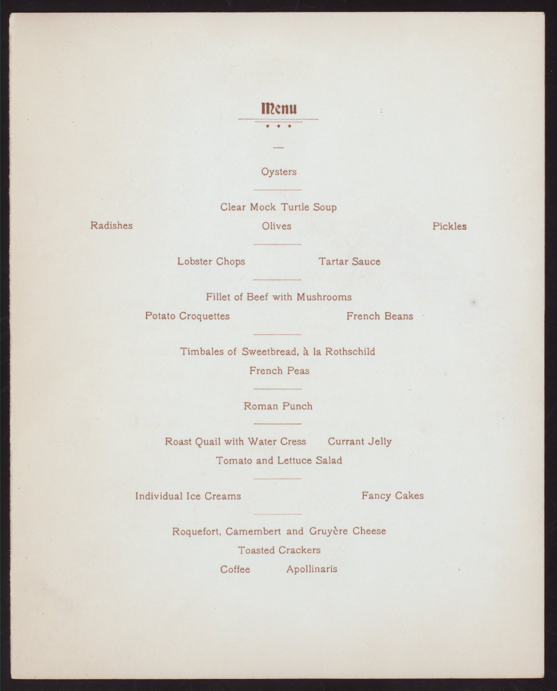 The third course of this meal, “lobster chops” were served with tartar sauce. It is no surprise that lobster appears on this menu since it has been a staple of New England cuisine for eternity. Native Americans would use lobster to bait their fish and as well as a fertilizer. They even cooked the shellfish by heating up rocks, placing the lobsters on top of the rocks, and then covering them with seaweed, similar to lobster-bakes of today. When the first colonists arrived in New England, it was recorded that the abundance of lobsters was so great that the bottom-feeders would wash ashore in piles two feet high.