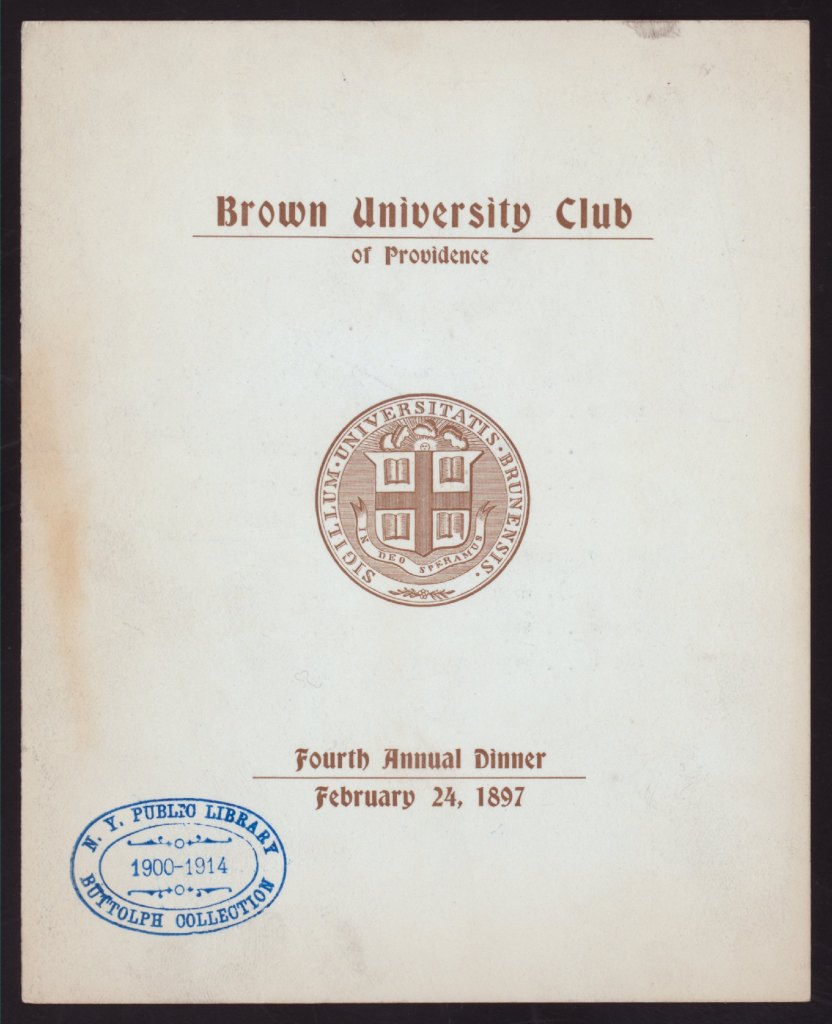 On Wednesday, February 24, 1897, the members of the Brown University Club met on College Hill, formerly Prospect Hill, for their fourth annual dinner. The dinner seemed to recognize the executive committee from 1896-1897 as well as to nominate the committee for the following year.