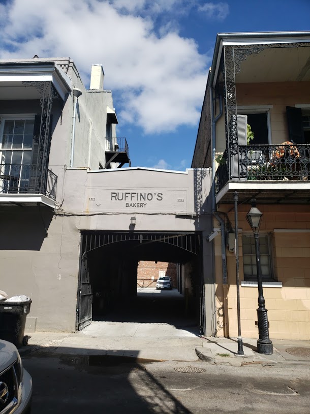 Giuseppe Ruffino, the head of the family, came to New Orleans from Cinisi Italy in 1892 with his wife Teresa. Together they had ten children all born in New Orleans. Giuseppe owned various properties in the Quarter. He first acquired the house 630 on St. Philip in 1919, his next purchase a year later was the 625 – 631 lot across the street, and his last holding on St. Philip was 628 in 1928. The family retained possession of these three properties until the late 1970s. With the purchase of the 625 lot, Giuseppe began the first of the Ruffino businesses—Ruffino’s Bakery. This bakery quickly became a staple in the French Quarter. His obituary in the Times-Picayune mentions Ruffino’s Bakery and its presence in the area. Another Times-Picayune article, this one from 1995, reproduced a picture of the entire Ruffino family taken in 1926 in front of the bakery. They call the bakery “a longtime Vieux Carre fixture.” If one wonders down this street today, the remnants of the bakery are present. Above the garage of the 625 house stands proudly in black raised letters against a light grey background, “Ruffino’s Bakery” and the dates 1907, 1923. However, the account of this bakery was not always a happy one.