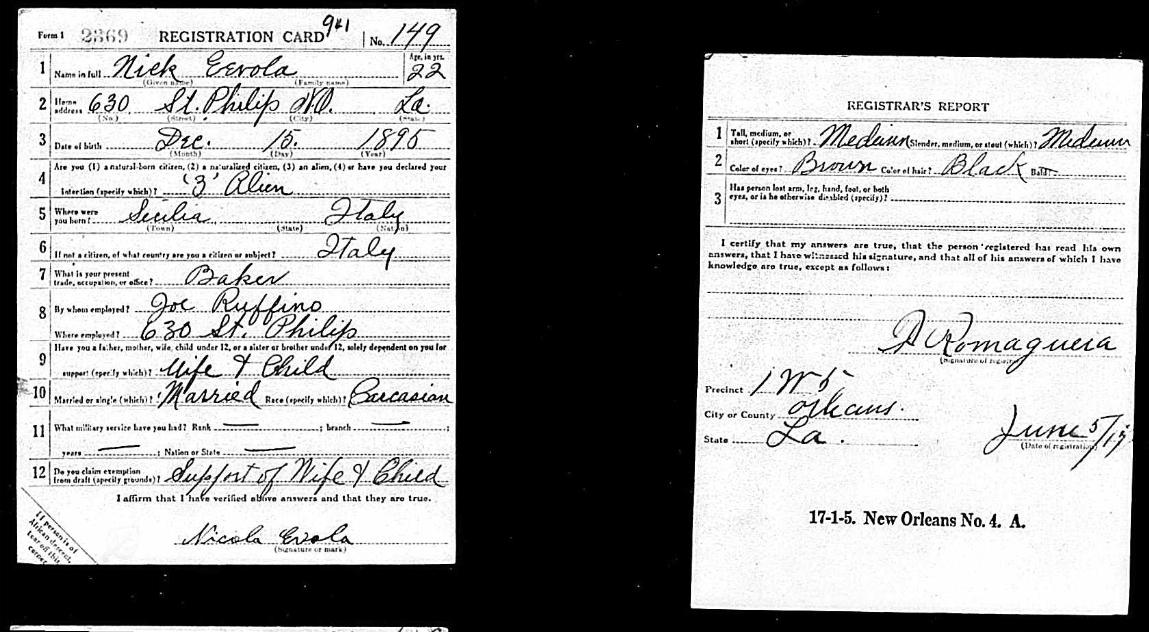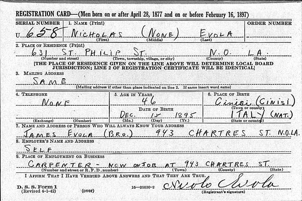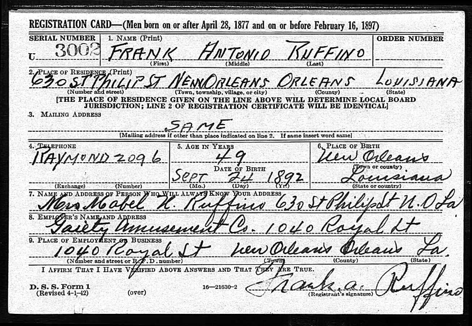 Information known regarding Salvador (Samuel) Ruffino shifts gears and focuses more on personal account. Salvador’s World War I Draft Card described him as a man, 23, of a medium height and slender build, complimented with black eyes and hair. His employment was as a baker at his father’s bakery. Between World War I and World War II he married Joshpine Conchilla and by the time of the Second World War he celebrated his 23rd wedding anniversary and was father to Mary Jane. When Salvador filed his second drat card in 1942, his residency moved one house down to 628 St. Philip. No longer did he work for the family however, but rather as an employee of Higgins Industries. The last article of information related to Salvador was his obituary. Here it was discoveredthat Josephine passed before Salvador and he remarried Marina Lorenzana, a second marriage for her as well. He became a step-father to Marina Maven and father to Frank, Joseph, Mrs. Joseph Assunto, and Mrs. Joseph Falo. At the time of his death, he was grandfather to 15 children and great-grandfather to another two children. With this, Joseph concludes this chapter of history on St.Philip with the last information regarding the Ruffino family.
