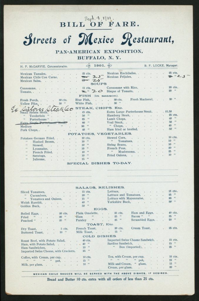 Donald C. Sweet had spent one entire summer on the actual streets of Mexico (Guadaljara, in particular) and he was inspired. Sweet was able to get a piece of land on the Midway to bring to life his Mexican inspired restaurant. It covered about 95,000 square feet and was one of the most lavish and expensive attractions of the Midway. Not only did Sweet’s dream and money get him an attraction in the Pan-American Exposition, but Sweet’s father had a mutual friend who was able to connect with William J. Buchanan, the then Minister of Mexico. With the help of his father, Buchanan, experienced showman H.F. McGarvie, and Frederick Thompson (the architect of the restaurant as well as other Midway attractions), the Streets of Mexico Restaurant was born. Although Sweet and McGarvie were in the driver’s seat with the restaurant, President Diaz of Mexico took time to help the men select bullfighters, muscianists, and artists for the restaurant. One newspaper article was excited to announce that the restaurant was going to have real Mexican women in their usual dress and Mexican men in their military uniforms. Since it was important to look authentic, it would also be important to have authentic Mexican food, but in that the restaurant wasn’t too authentic.