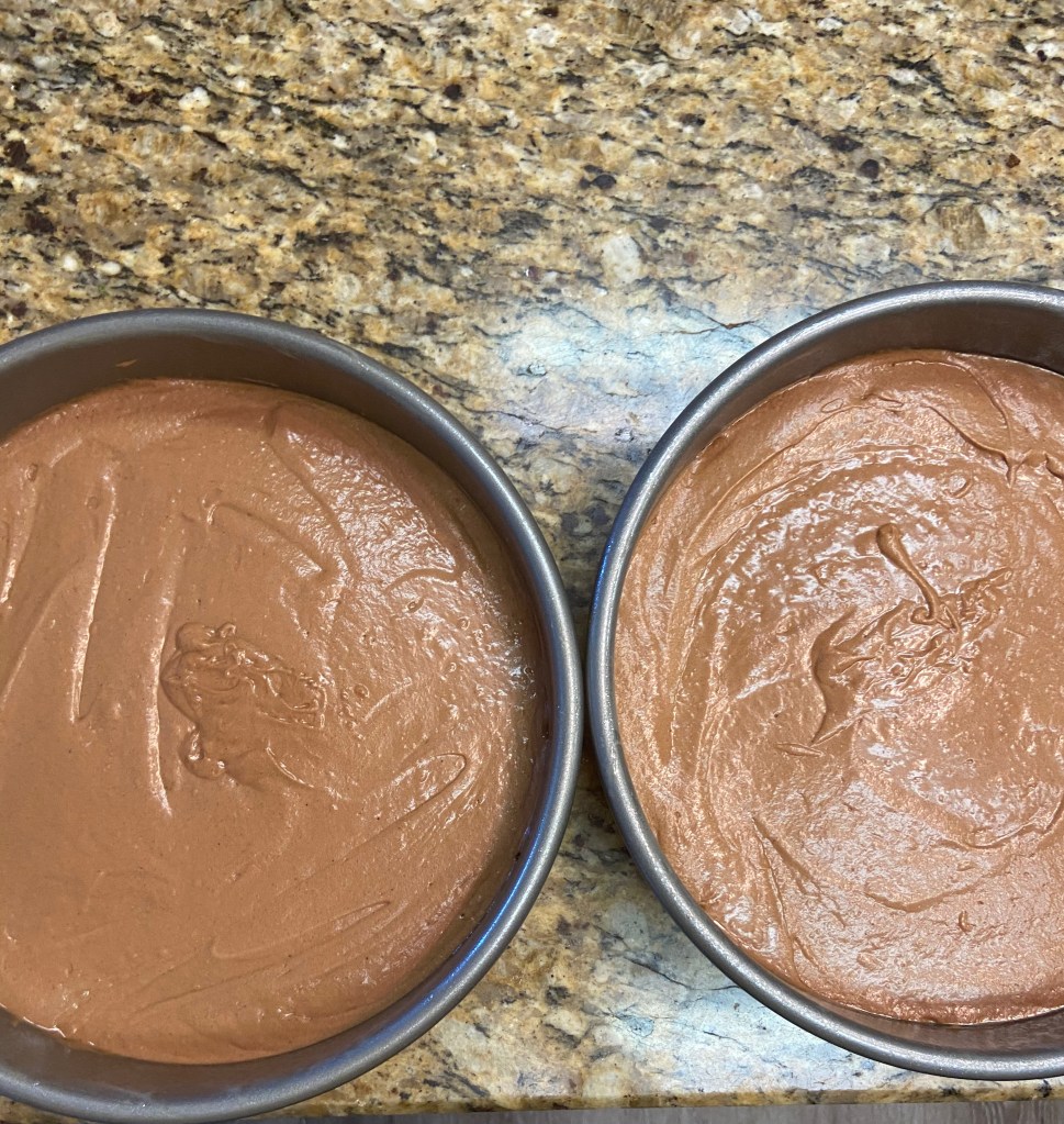 Now the cooking begins! I’m starting to boil the water for the chocolate and starting beating the butter and sugar together. I melted the chocolate over a low heat to make sure it didn’t seize. Once glossy I added to my mixture of egg and butter and then in a few short minutes I got my fluffy cake batter! Now the recipe didn’t say to grease and line your pan but I know better than that and went ahead and did it so that I can get my cake out in 20 minutes. I put my cakes in their pans and sent them into the oven with a cup of water (my mom swears this keeps cakes moist) and said a quick affirmation that they’ll look good in 20.