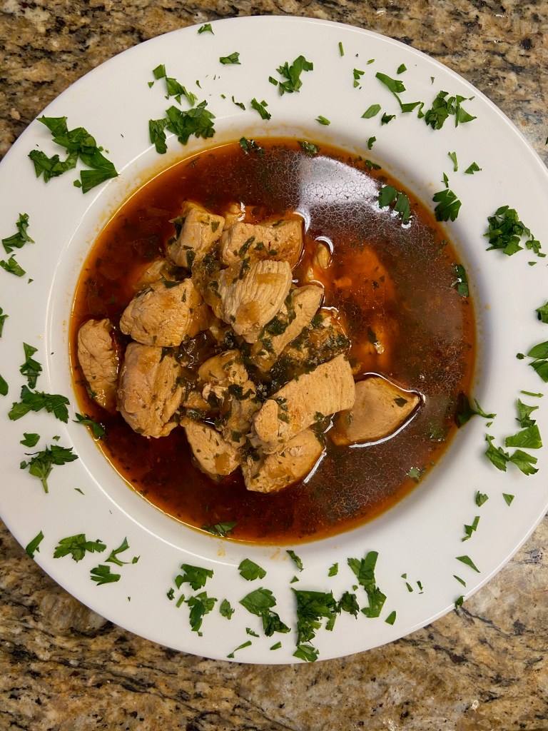 After my chicken was browned, I added the water, parsley, and salt and put a lid on it to simmer. After 10 minutes my chicken paprika was done! I plated it up with parsley on the side like the recipe suggests.