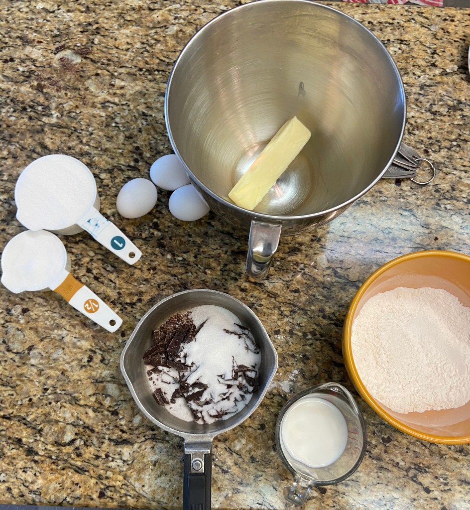 I’m starting my cooking with the chocolate cake that way it has time to cool before icing it. I’m using semi-sweet chocolate as the recipe just says baking chocolate without a specification on what kind. The recipe also says to set the oven at a “moderate temperature” and by today’s cooking standards that is around 350°, so that’s what I’m going for with this recipe. The recipe says that it will make two sheets, so I’m making two nine inch rounds hoping I can get a two layer cake. Luckily I live in a time of modern luxuries so I have access to my mom’s stand mixer which will come in handy for the mixing process. Here are all the things needed for my cake making process to begin! After measuring everything out, I’m starting to feel a little nervous that there might not be enough flour to get me the two rounds that I want.