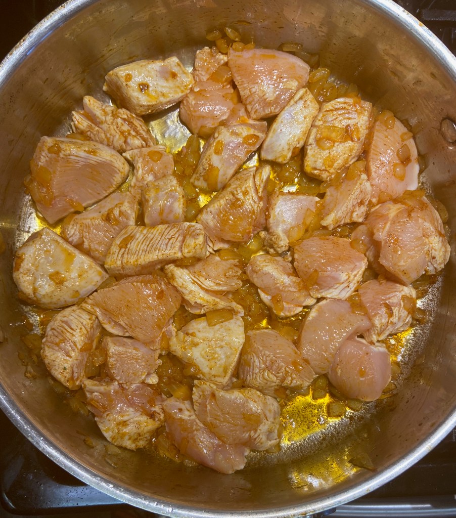 With everything chopped and ready to go, I’m heading to a skillet to get things started. After Sautéing the onions for around three minutes they got their yellowish color. This means it’s time to add the chicken and the paprika!
