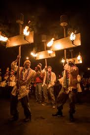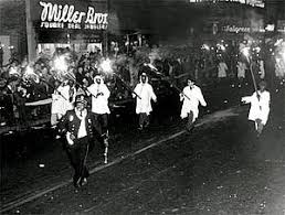 Flambeaux carriers are a part of New Orleans Mardi Gras and Carnival tradition. The carriers have been a part of Mardi Gras since as early as 1872 and are still around today. The carriers walk next to the floats of parades and light the way for them, and provide another form of entertainment at the parades. Throughout history with strikes, the civil rights movement, world wars, and technology the carriers have remained an integral part of New Orleans Mardi Gras. The carriers originally started out with a vapor burning lamp on an iron cross and now have turned to aluminum rods doused in kerosene to keep the flame alive on top. Flambeaux Carriers are a part of Mardi Gras, but were almost gone after 1946. With World War II ending the previous year the carnival season was ready to make its comeback and looking to entertain many once again. “The strikers demanded five dollars per parade, a significant increase from the two dollars they were paid before the war, but a raise they said they had been guaranteed.” 1