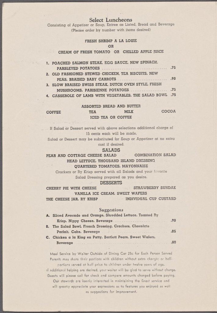 The transportation time from California to New York via train was approximately 83 hours or faster. A citizen would leave New York Monday morning, and arrive in San Francisco Thursday afternoon (Kiger, 2019). The travel time presented an opportunity for the train industry to provide food to their passengers to create a delightful atmosphere and to keep citizens fed. Below is a luncheon menu provided from the Union Pacific Railroad for the special train en route for Mayor Rossi and the California Grays in 1939.