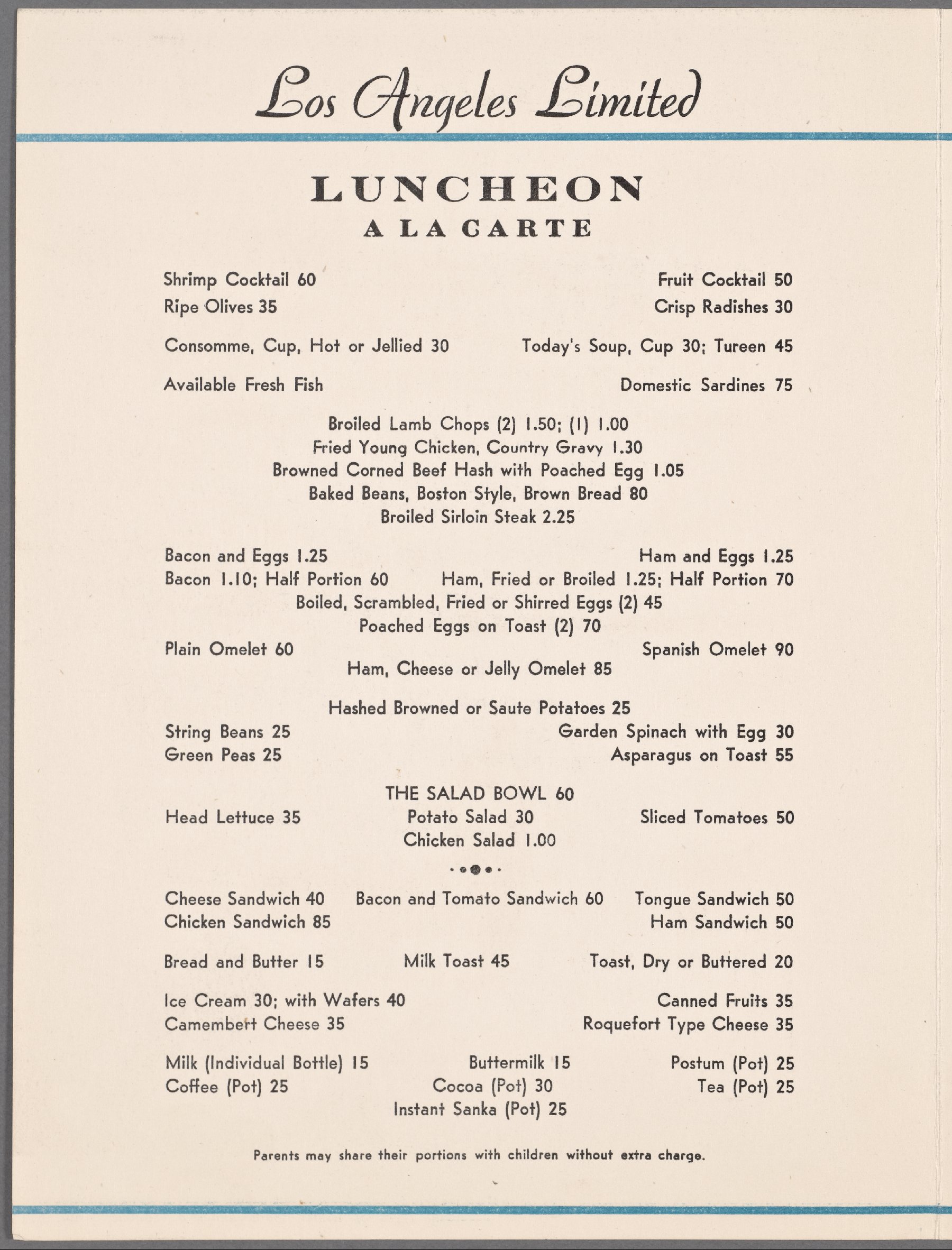 A unique part of traveling on the Los Angeles Limited was the dining experience on the train. While journeying to their destination, passengers were able to order a multitude of meals such as broiled lamb chops, fried chicken with mashed potatoes, or even a broiled sirloin steak. In order to serve these kinds of meals, they had to be able to keep both meat and dairy fresh and cool for roughly forty five hours — the amount of time it would take to arrive at the destination.