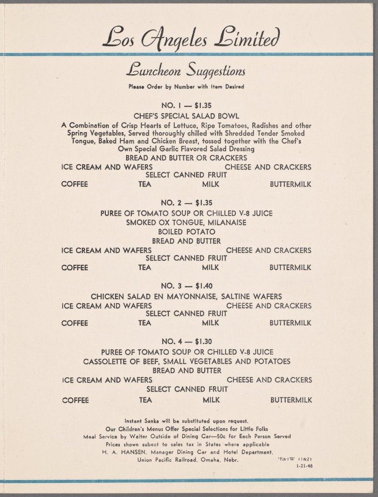 This gives the impression that the people who are traveling on the Union Pacific Railway were wealthy families, likely going on vacation since the train traveled to Sun Valley Ski Resort. It’s also extremely possible that the passengers who partook in dining cars were white, with very little exceptions. This menu was from a 1948 train ride, which was years before the 1964 Civil Rights Act had prohibited the discrimination against race and integrated the United States. While people of color could still ride on the train in a separate car, the additional (and severe) cost of the railway’s dining likely would make the overall cost of the ride too expensive.