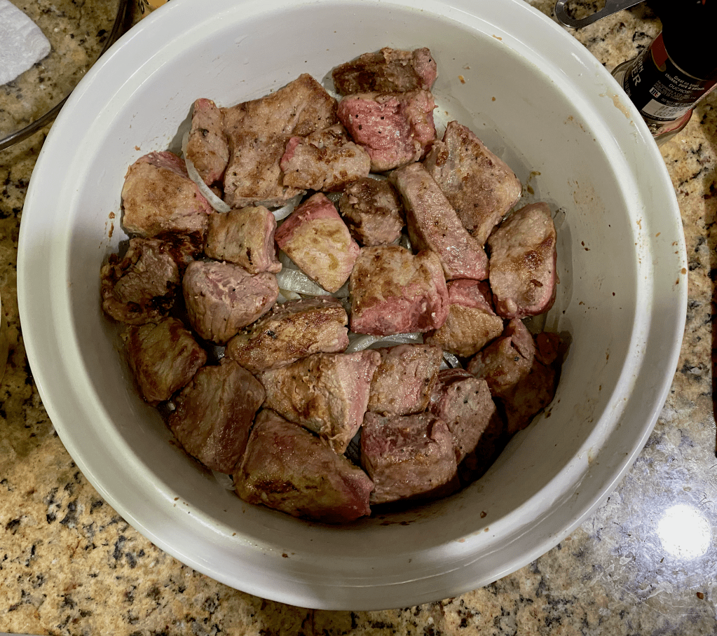 The recipe from The “Queen ” Cookery Books Number 5, Meats and Game had no cooking time listed. It also said to pour a Gil of stock into the pot, I wasn’t sure what a Gil was, so had to research. In order to find more details on the recipe, images, and better directions including cooking time, I looked up similar recipes online. I tried to find ones as close to the original recipe as possible. I found four or five good recipes to look at and base the cooking time and just see how the recipe should come out. All the recipes were pretty similar, with only a couple of changes in the way they cooked the stew or the choice of meat. I chose to use an English woman’s recipe because the original recipe is English so I felt it would be correct to follow. In her recipe, she cooked it slightly differently but she had directions for when cooking it in the oven. She used lamb instead of beef, so that was one difference. I followed the way she cooked the dish in the oven, heating the oven to 350 degrees and cooking it for an hour covered, then raising the temperature to 400 degrees and cooking it uncovered for another 30 minutes.21