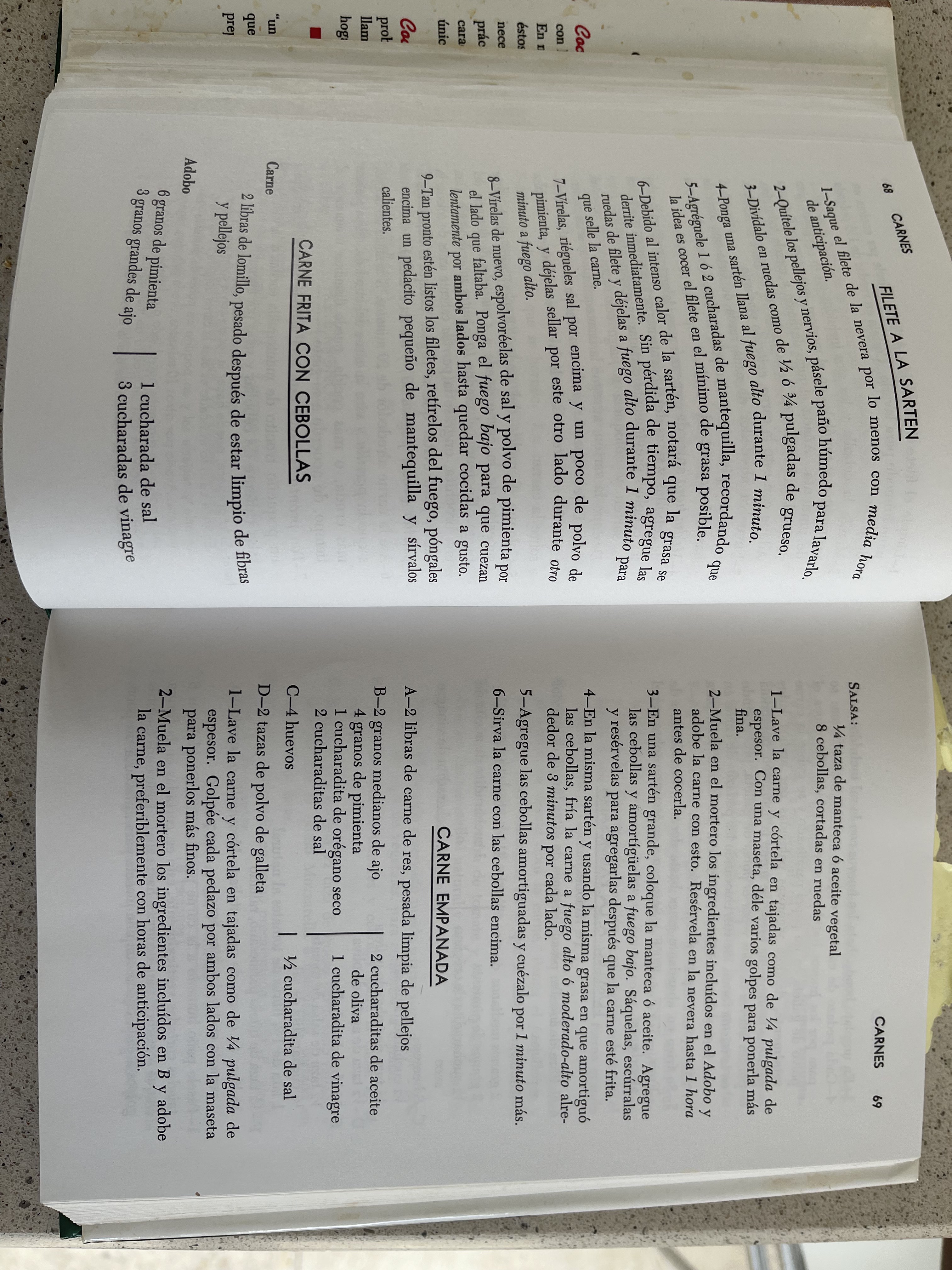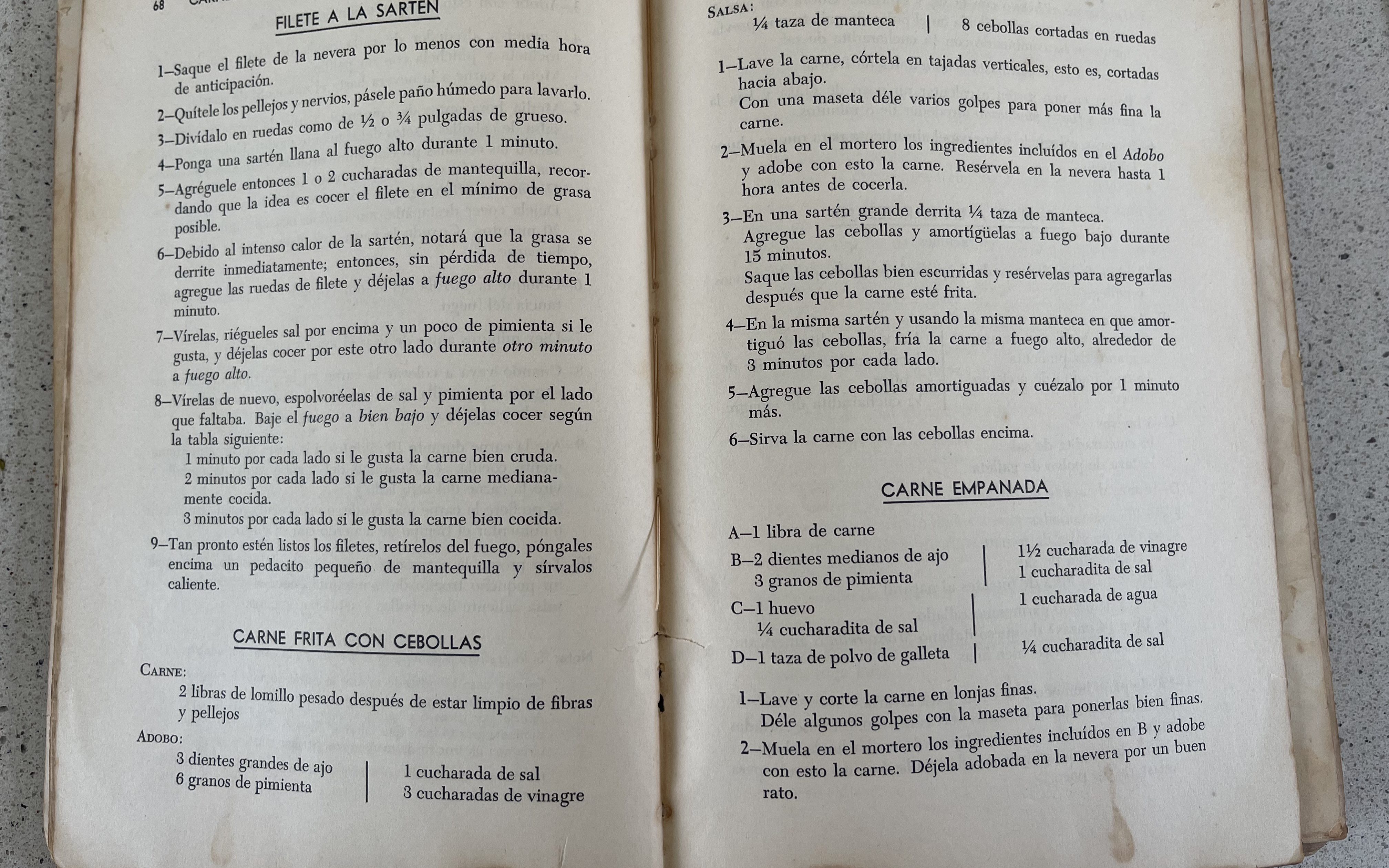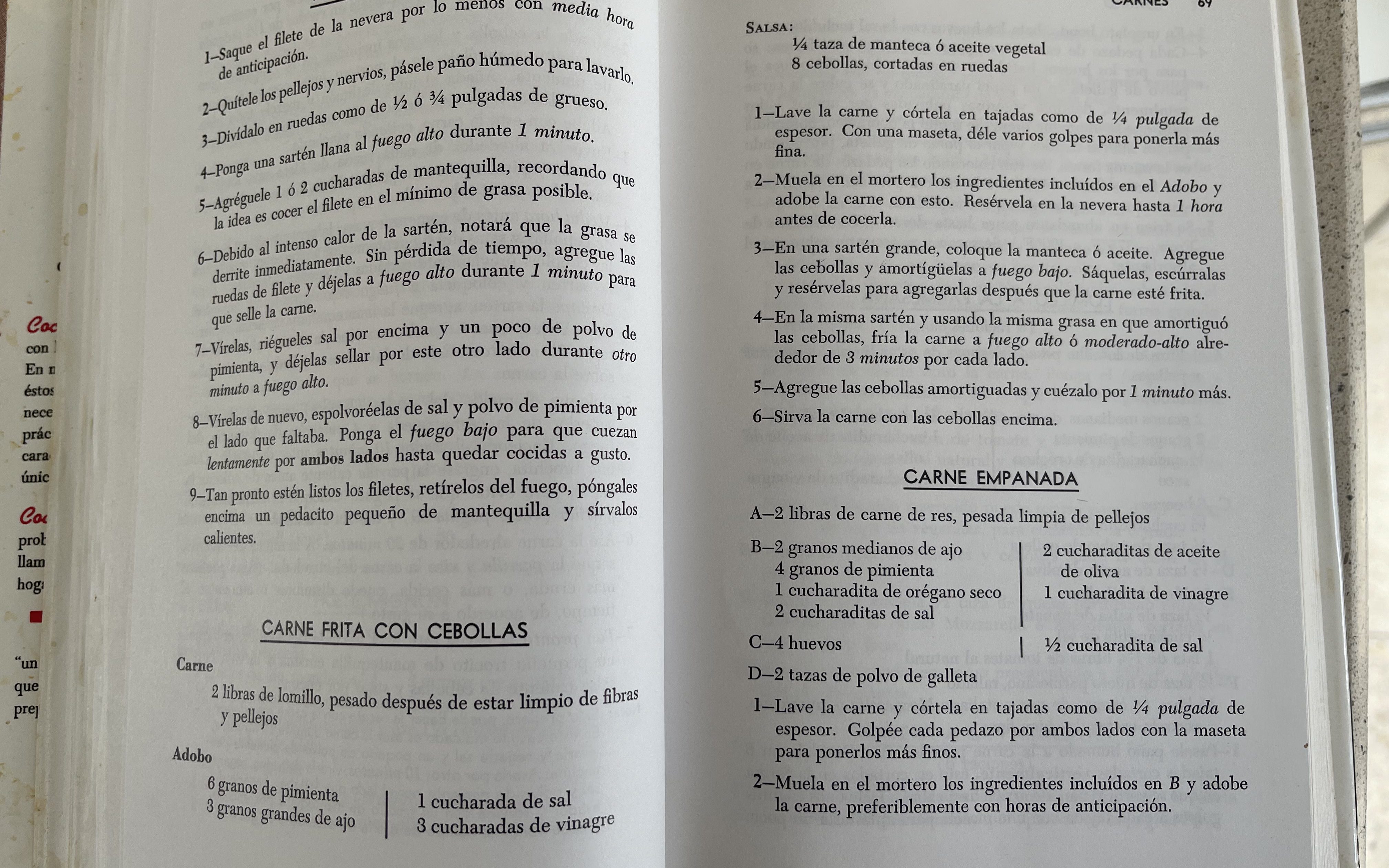 Another example of this would be the error present in the “Carne Frita con cebollas” (Fried meat with onions) recipe. In the Spanish version the recipe calls for the recipe to be done with pork loin, but in the English version, since “carne” means meat, when it was translated they changed the pork for beef, “fried beefsteak with onions”.