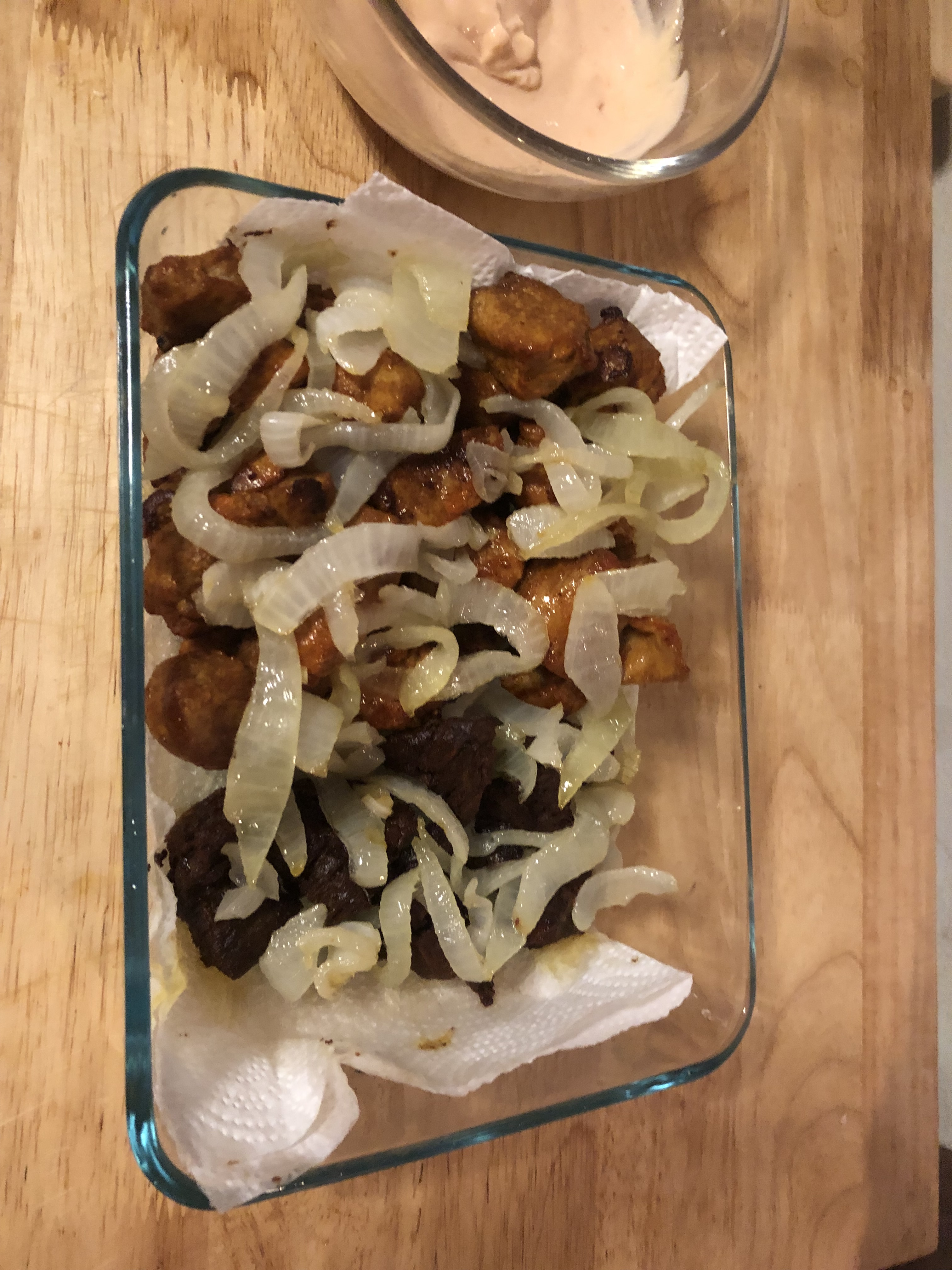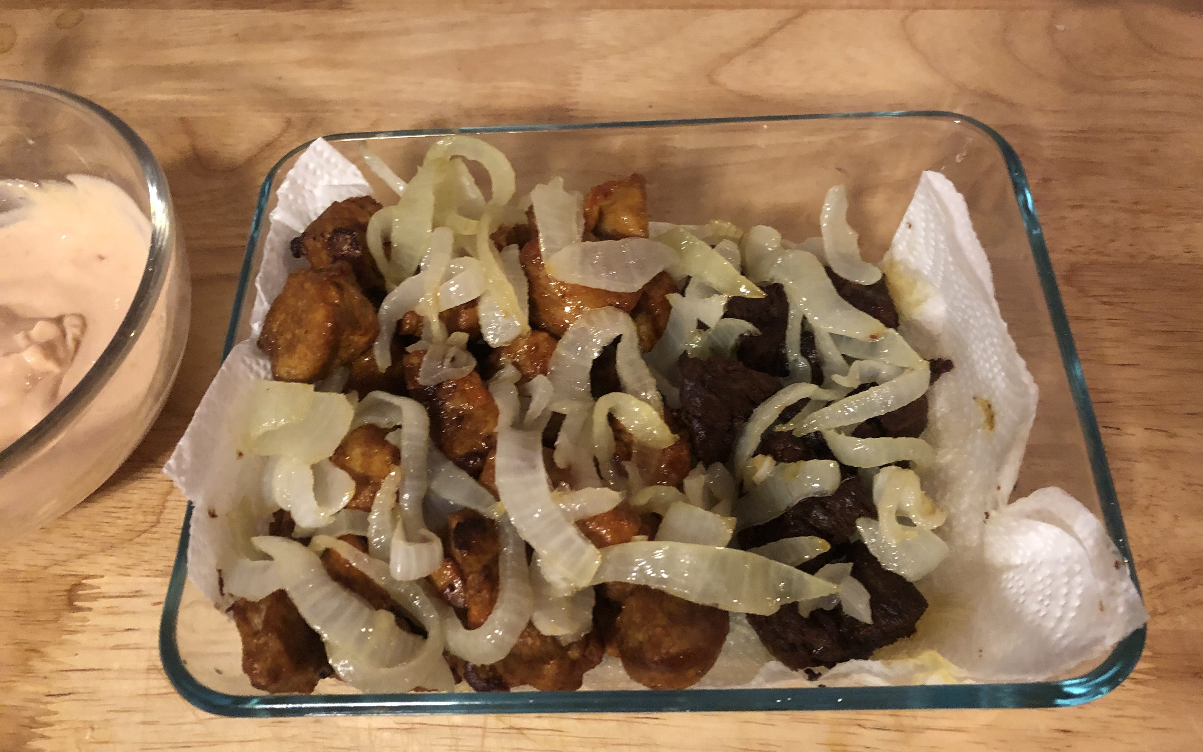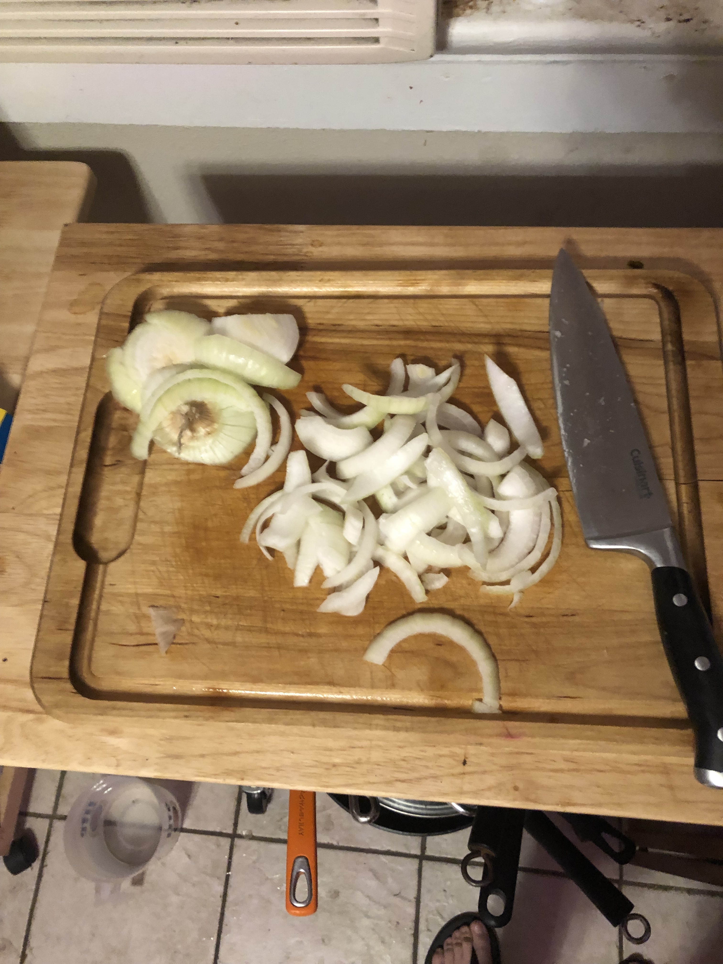 As a born and raised Puertorican “Carne Frita” is probably one of my favorite dishes, I can eat pounds of it in one sitting. To prepare this dish you must clean 2 pounds of pork loin by removing fibers and skin as a preparation and cut one yellow onion.