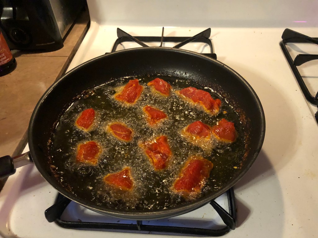 Step 4 requires that in the same frying pan as before, fry the meat on high heat, 3 minutes per side. Remove meat and let it stand.