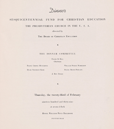 The specific menu chosen for this project is from 1939, when the hotel hosted the Sesquicentennial Fund for Chirstian Education dinner. For those unaware (as myself when I first read the word), sesquicentennial refers to the 115th anniversary of a particular event. This event was directed by the Board of Christian education of the Presbyterian Church of the United States.