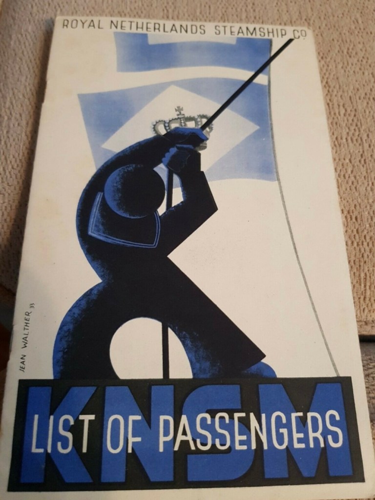 A list of passengers is available for purchase on Ebay which lists prominent first class passengers such as Mr. and Mrs. Hill, Mr. and Mrs. Fletcher, and Mrs. Barret accompanied by her son. This pamphlet on Ebay also includes the route of the ship. Noted on the pamphlet is the name “Jean Walther”, a prominent artist who designed the image on the front of the brochure. It is interesting to note that he is French, not Dutch, but he designed many other posters for the Koninklijke Nederlandsche Stoomboot Maatschappij.