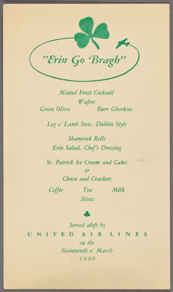 Interestly, before 1936, there was no hot food onboard airplanes. The first airline meals were pre packed lunch boxes, served cold. United Airlines was actually the first airline to install kitchens on-board and provide passengers with hot meals. United Airlines early routes were east to west, from New York City and Salt Lake City to San Francisco, and north to south, along the west coast. The people flying on airplanes at this time were the wealthy. A flight from New York to San Francisco was around $160 one way, around $2,868 today. Because of this, the on-air food catered to those wealthy enough to travel, and was less of a modern convenience and more like a full dining experience. This is seen specifically with the fact that these menus are themed, meaning that for a holiday, such as St. Patricks Day or Valentine’s day, one could spend it aboard an airplane as a luxury experience. It’s not the destination, but the journey… right? Both menus have similar layouts: appetizer, entree, snack, dessert, and drinks.