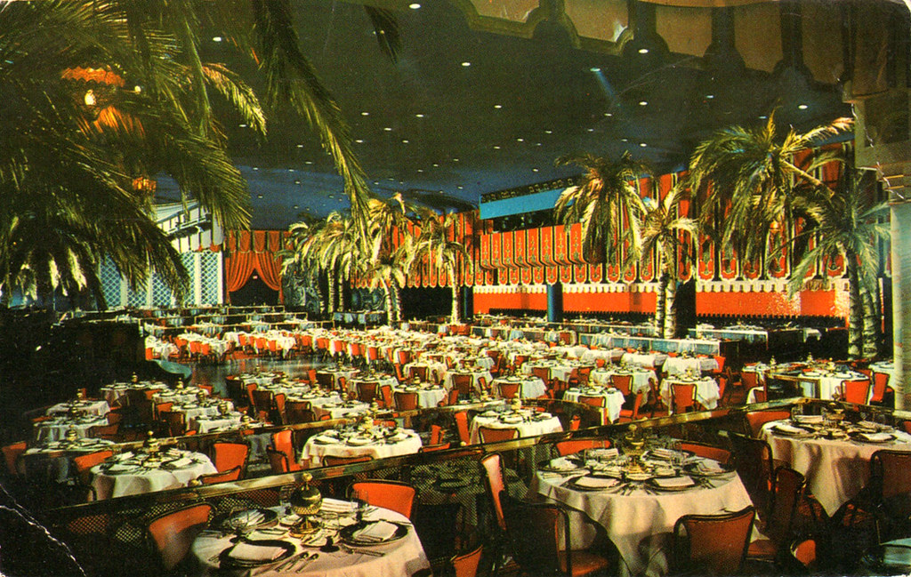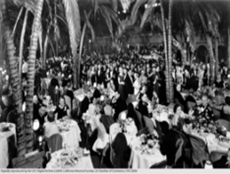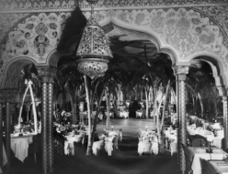 The elaborate and highly decorative scheme of the rooms featured pastel tints in the furniture, soft cretonne, beautiful English prints and original paintings on the walls. Ten thousand chairs were needed to furnish the restaurant. The kitchen operated at such a great scale that 4,000 dinners could be prepared at one time. The main dining hall was extraordinarily large and could accommodate twelve hundred persons, which covers half an acre of floor space. Cocoanut Grove opened four months after the hotel which resembled a starry sky decorated with Moorish style. There were coconut palms made of paper machetes swinging from the branches with stuffed monkeys.