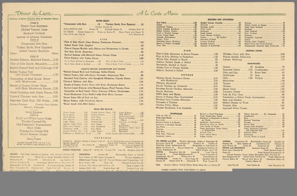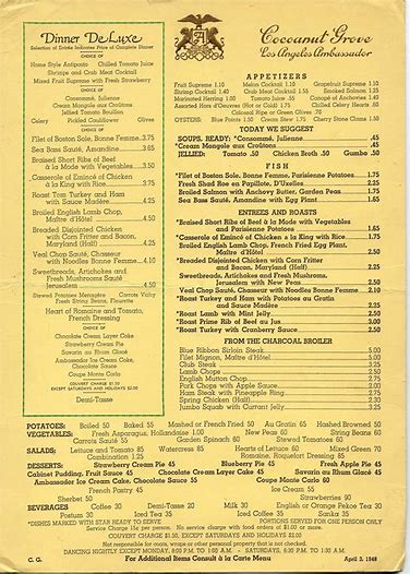 This menu dates back to the early 1930s and celebrated the monkeys that roamed Cocoanut Grove. It shows each item displayed and served in the restaurant, which in previous writing explained the immense number of dishes put out per night due to the large room and capacity it held. An interesting part of this dining is the fact that a $3.00 special dinner offering four different courses. Though, the equivalent of $3.00 back then and today are significantly different, equaling about $50 today which is a great cost for a high-end, well-known restaurant. The fact that this ‘night club’ and dining service brought attention to a variety of people, including celebrities is enticing for the advertised price.
