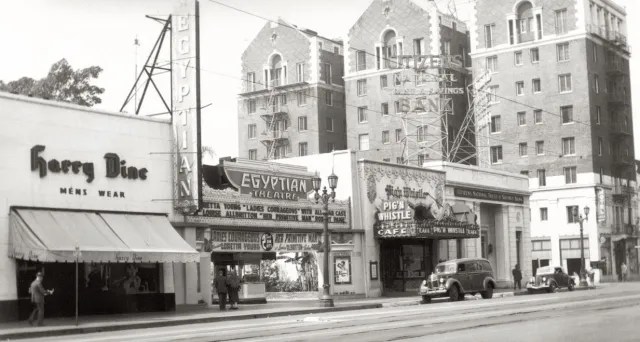 The very first Pig’n Whistle is said to have grown out of a candy store and ice cream shop in 1908 that was started by a man named Frank L. Callebotta a few years prior in San Francisco, not Hollywood (Whitaker). It was this location that became the hub of operations for the company and from there more locations began to spread throughout California. By 1912, another location opened in Oakland followed by another opening on South Broadway, Los Angeles in 1914. In 1926, the Pig’n Whistle brand made a push to expand their chain even more, and by 1929, they were opening their twentieth location. The main location was in San Francisco, but when Hollywood started booming, another famous location opened there as well in 1927 (Kang). Located in Hollywood on the south side of Hollywood Boulevard, the restaurant was surrounded by other landmark attractions, such as the Egyptian Theatre, that would draw crowds and often many celebrities who were working nearby.
