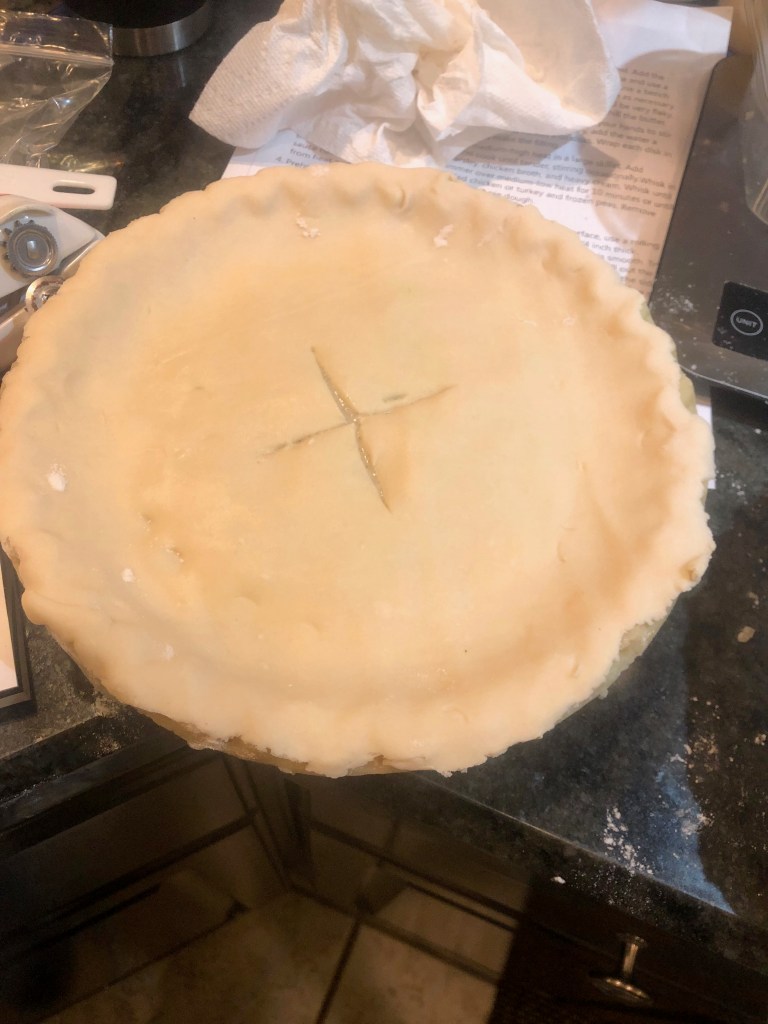 The biggest challenge for me was making sure I added the ingredients in while stirring and making sure I continued to stir so the food would not stick to the pan or burn. Once the stuffing was ready to be put inside the crust, I carefully scraped it out of the pan and into the pie before placing the top layer of crust over the top.