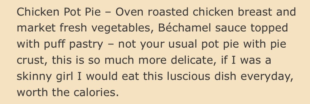 “…it had the second-best chicken pot pie in Hollywood– with Musso and Frank grill being the best.”