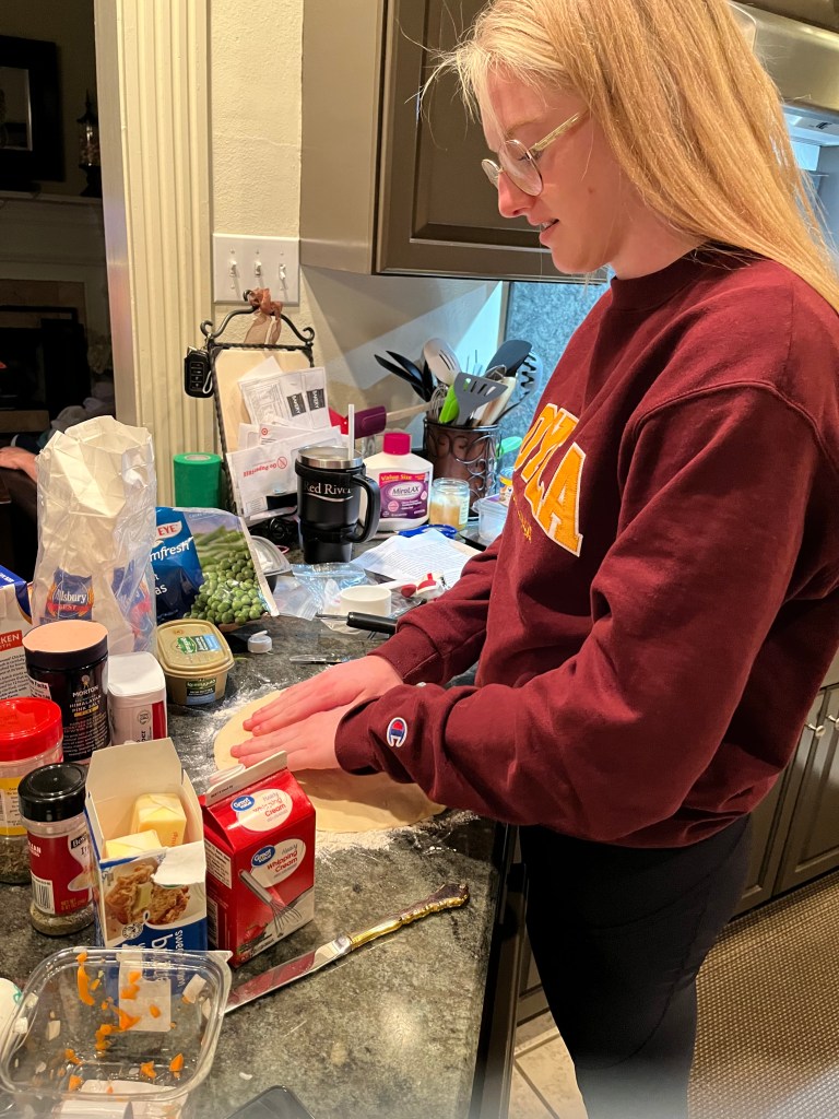 The most challenging part of recreating this recipe was definitely making the pie crust. Making a homemade crust was way harder than I thought it would be, especially because I am not someone who usually cooks, nor have I ever made any kind of bread or crust from scratch before. The biggest challenge I kept running into was making the crust too thin and having it rip or get a hole somewhere in the dough. I kept having to re-roll/knead the dough over and over until I managed to get the thickness even enough without having any holes for the stuffing to fall through. Once I was able to accomplish this to my best ability, I put the dough into a pie tin and began working on the stuffing.