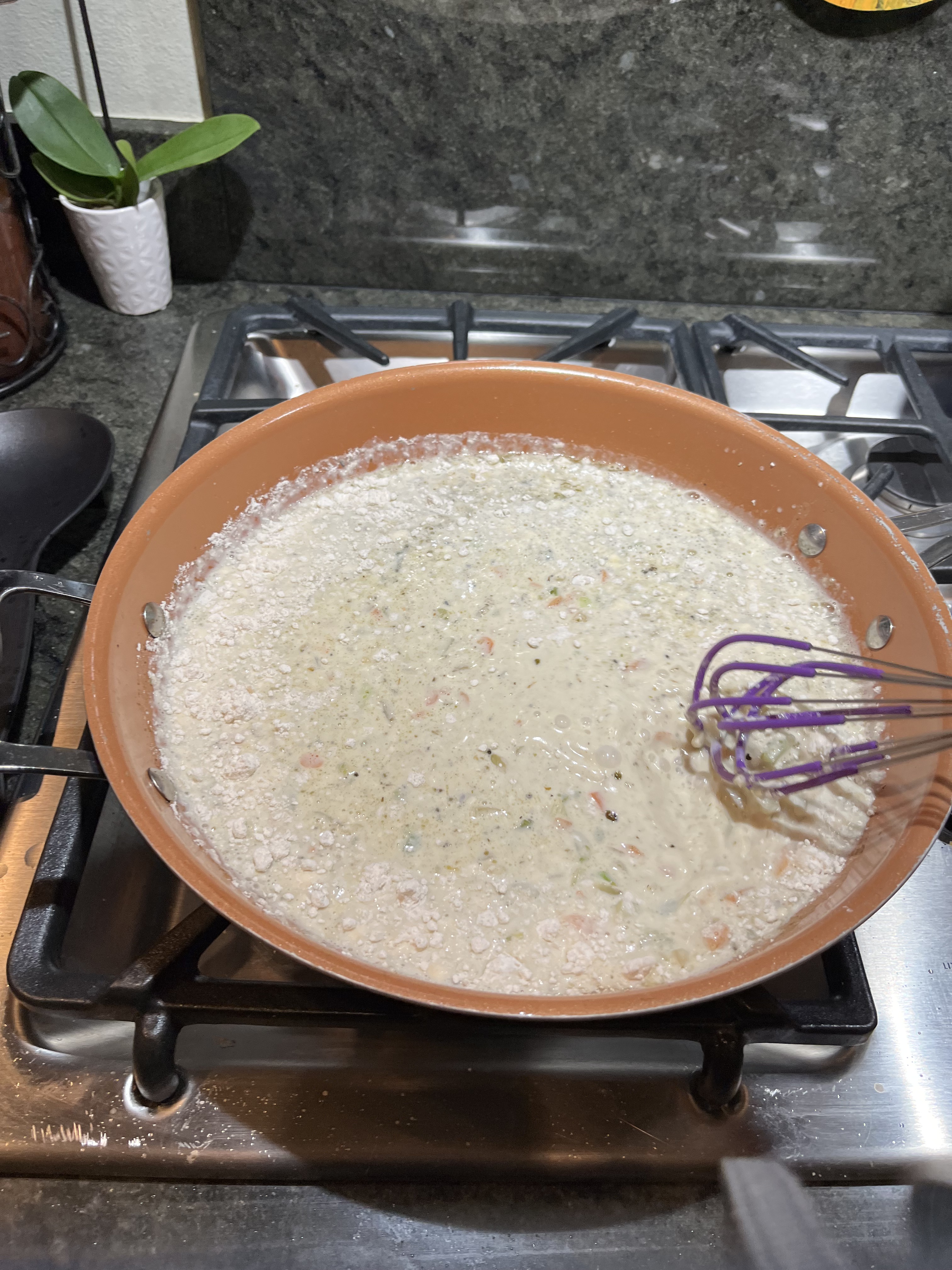 While my goal to try to recreate the exact Pot Pie from the Pig’n Whistle was sadly not possible, I did use less accurate measuring tools to try to interpret the recipe as much as possible and recreate the story of the chefs who were making it back then. When the recipe called for six tablespoons of unsalted butter, I used an actual table spoon instead of a measuring cup to measure out the ingredients. I did the same for the teaspoon ingredients, using a small spoon for stirring tea to measure out the salt and black pepper. When the recipe called for a cup of any ingredient, I used a plastic cup that held around eight ounces of liquid to measure out a cup (or more) full of that ingredient (frozen peas, shredded cooked chicken, and chicken stock).