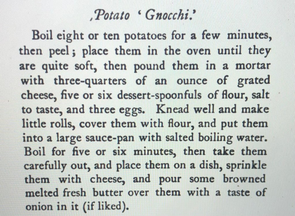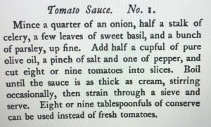 In collaboration with my research on the author and cookbook, I decided another way to truly get an understanding would be to make some of the recipes in the book and compare to how the modern version would be made, according to my understanding. I decided upon making gnocchi and an accompanying tomato sauce from the cookbook to try to get a range of some of the recipes present. I started with the Tomato Sauce No. 1 and the recipe is written as follows: