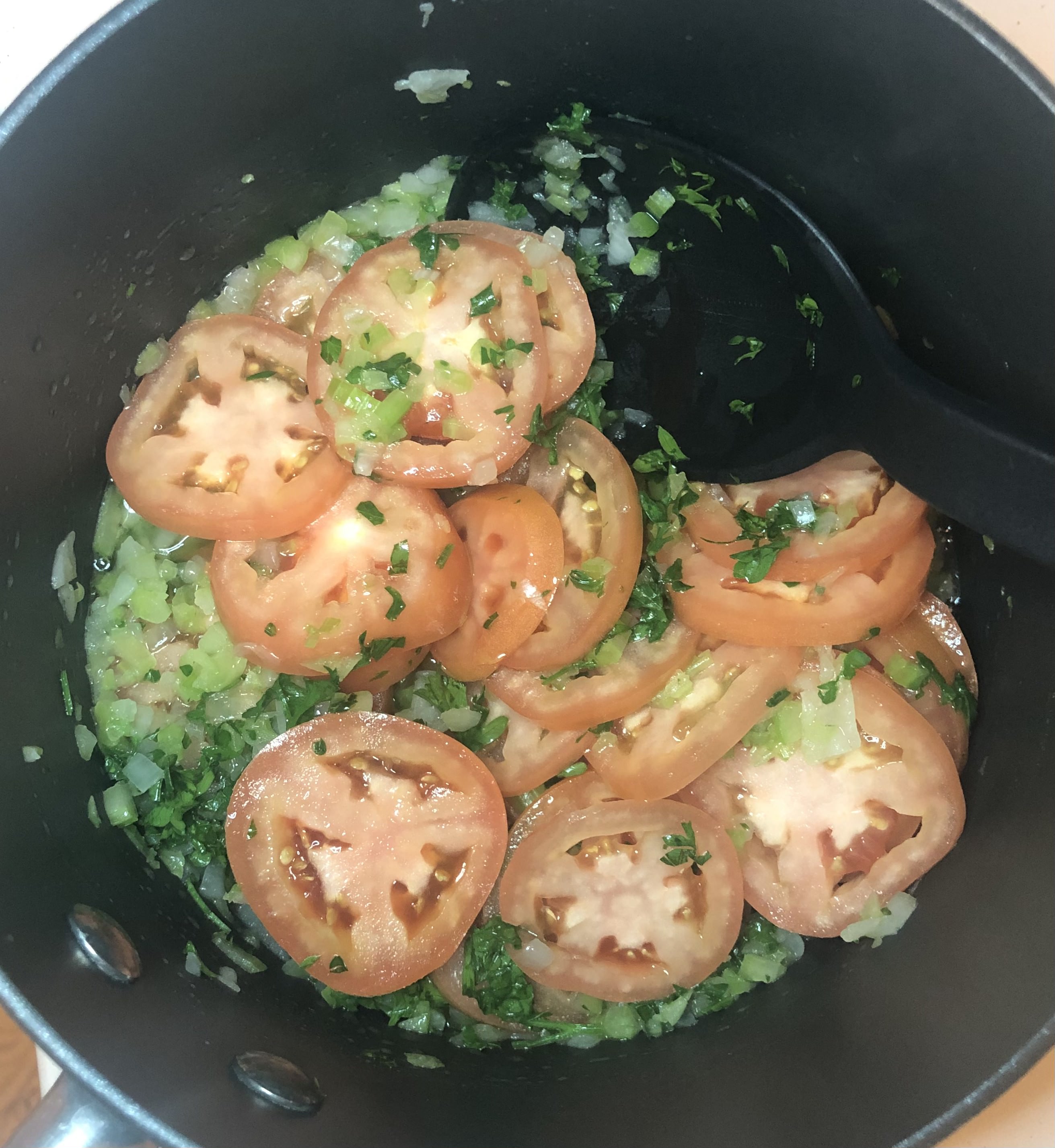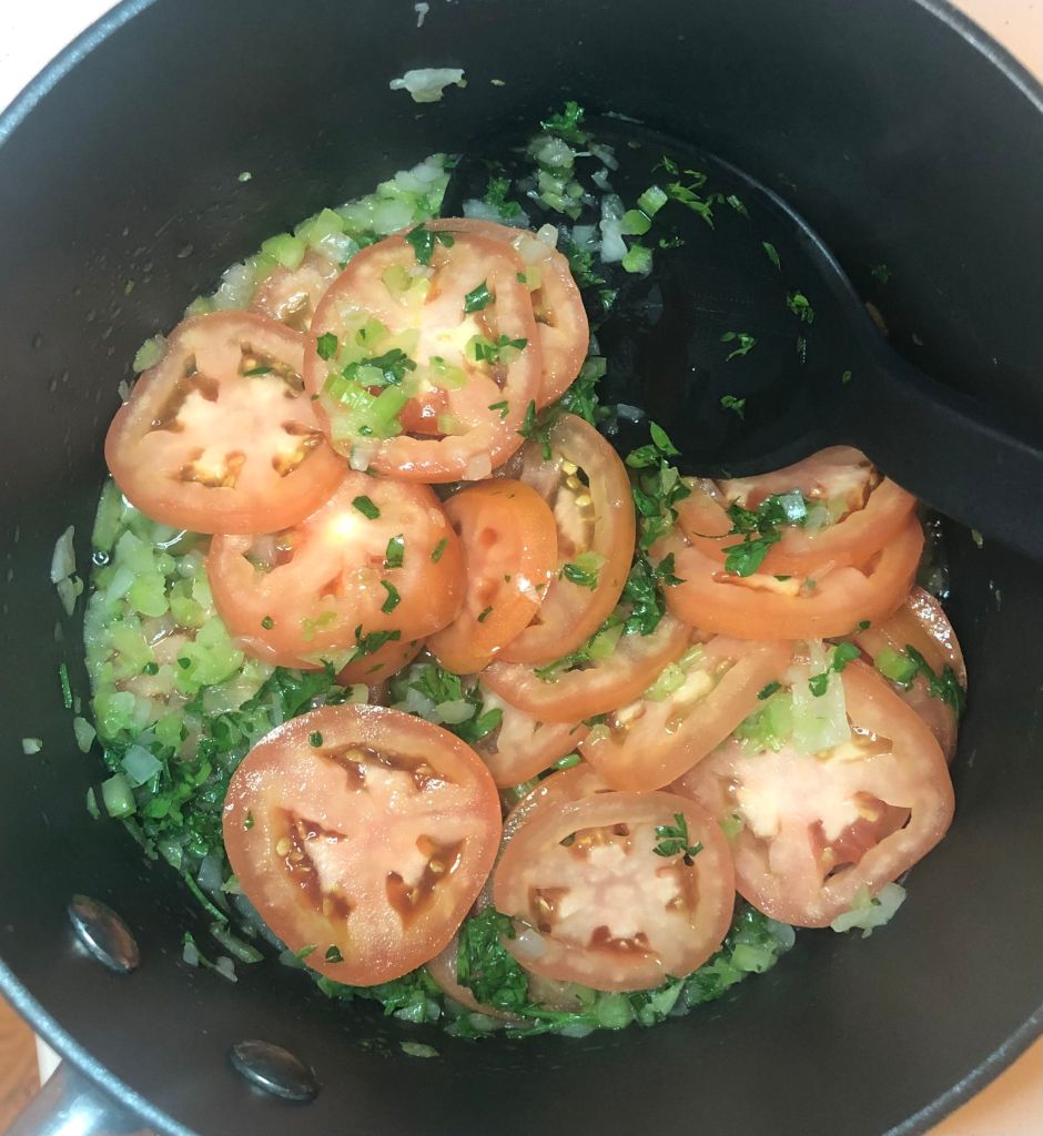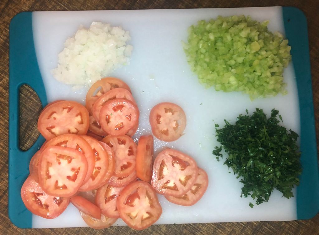 I then minced a quarter of an onion, a couple sticks of celery, a good amount of parsley and I sliced my tomatoes.