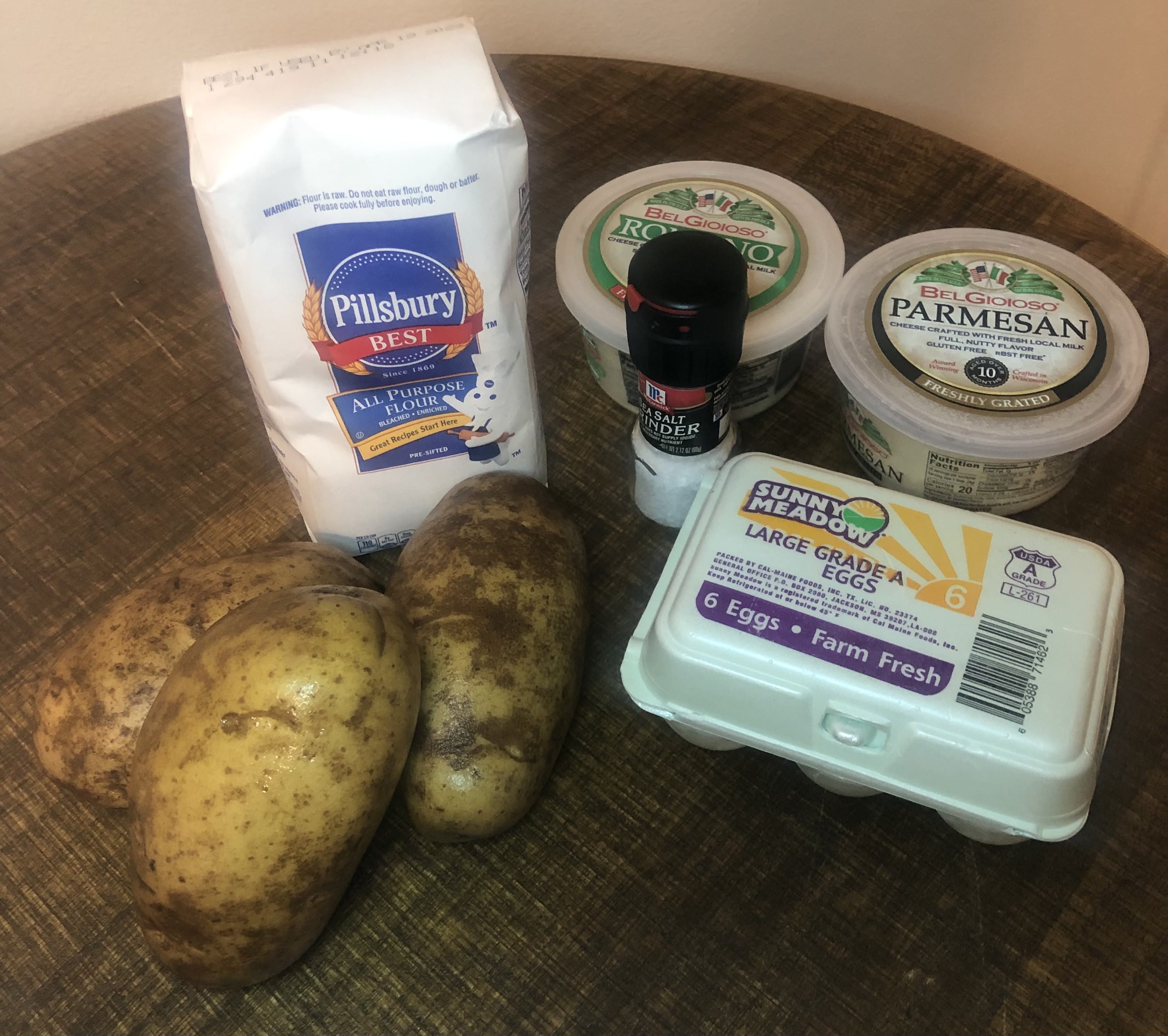 I gathered my ingredients for the gnocchi recipe (I approximately halved this as well) which included three potatoes, flour, in which I needed to look up about what a dessert spoon looks like, about 2 eggs, salt and grated cheese (I chose both Romano and Parmesan because I, unsurprisingly, had both on hand).