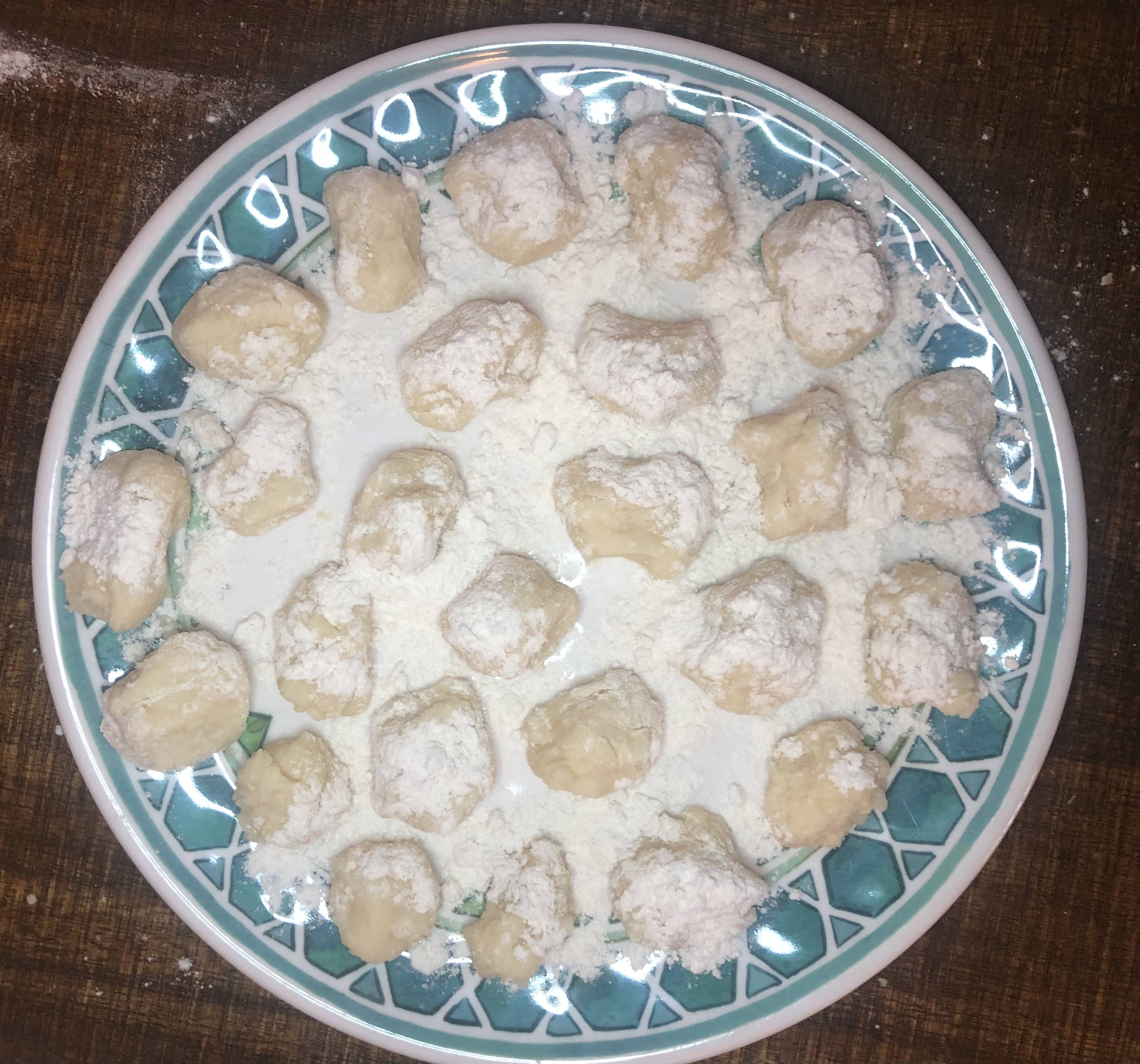 At this point, I decided to finish making the gnocchi the next day and just reheat the sauce for the final pairing. So, the next day I took my “mashed potatoes” out of the refrigerator and waited for them to start to come to room temperature and make my dough with the cheese, eggs, flour (which I decided to add more than the recipe said as my dough was very sticky) and salt. I then did my best to roll the dough into balls and covered them in flour, as noted in the recipes. (This made me laugh because they almost look like mini beignets covered in powdered sugar in this picture!)