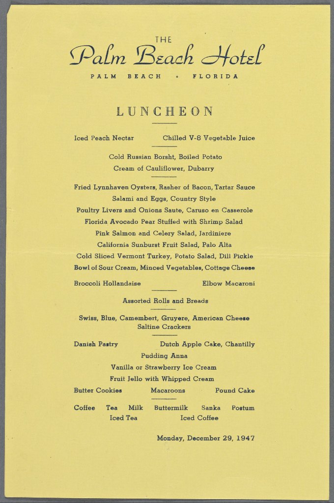 As eleven-year-old Charles Cochran sat down for lunch with his wealthy parents at the Palm Beach Hotel during December of 1947, he was certainly unaware that his meal, his surroundings, and even his location on the exclusive island were the results of revolutionary technological and scientific transformations made over the preceding hundred years. Without the Industrial Revolution, his grandfather could not have accumulated the large fortune that enabled his family to spend its winters in the Florida sunshine. Without transportation, the island could neither have been reached nor developed. Most importantly for our purposes, without stunning advances that involved the industrialization of agriculture, the preservation of foodstuffs, and the transportation of these items across this vast country, Cochran could not have enjoyed many of the items on the luncheon menu. Much of the food had to be chemically fertilized, mechanically sown and harvested, mass produced, transported by ship or railroad, and refrigerated or frozen in order to arrive on his plate fresh and delicious. The menu for December 29, 1947 demonstrates that what we can eat at any given time depends upon what is produced, fresh, and available. By the middle of the last century, for the wealthy, that was virtually anything. Perhaps the most important—and upsetting—discovery of this project has been the complete lack of information available as to what the middle and working classes ate across the bridge in West Palm Beach, less than half a mile away. My initial objectives were centered around the class distinctions and economic inequalities that were (and are) rampant in South Florida and how these played out on menus of the day. Nothing I was able to find in the Historical Society of Palm Beach County, or on JSTOR, really spoke to this. Menus are simply not available for the restaurants of West Palm Beach during the 1940s. I guess I should not be surprised after all. Palm Beachers lived then as they do now, giving little thought to how the rest of us live.
