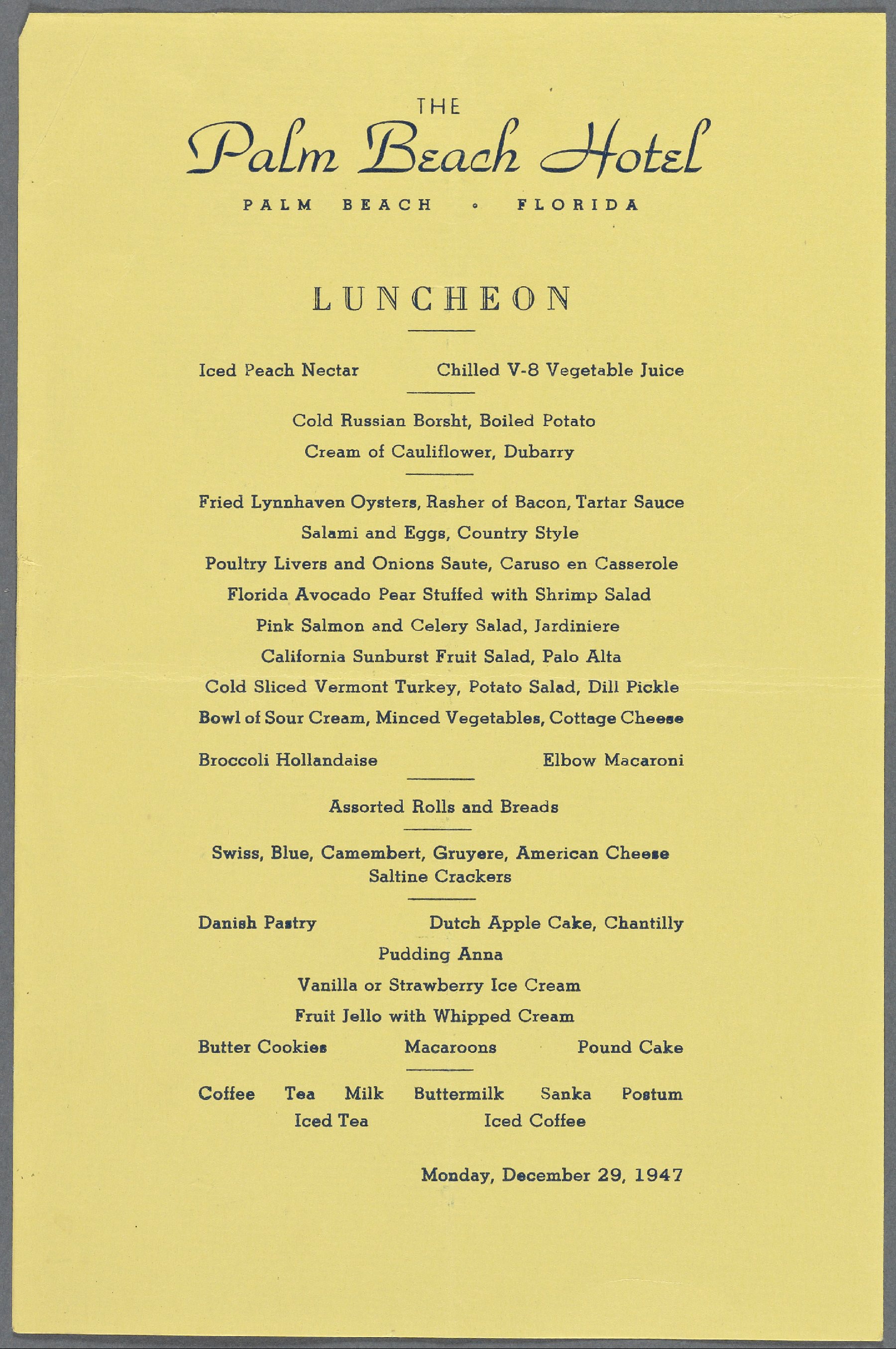 Beginning in the middle of the nineteenth century, revolutionary changes took place in the production, transportation, and industrialization of agriculture, the advent of steamed transportation, and the refrigeration of perishables combined to allow for a variety and availability of grains, vegetables, fruits, and meats that had previously been unimaginable.1 Once refrigeration was added to the railcars that traversed the nation with rapid speed, even seasons hardly mattered. By the middle of the twentieth century, almost anything edible was available almost anywhere, at any time of the year. With the advent of the Industrial Revolution, cities grew. Better transportation allowed for workers to commute to these cities. Technological advancements in food production and preservation lowered the prices of food. Consequently, restaurants became popular and affordable for the working class. It was no longer only the idle rich who could dine out. Nevertheless, the wealthy continued to eat at restaurants. The newer, faster, and better railroads took them to their winter homes in South Florida, where the revolution in the food industry allowed them to eat from menus, the likes of which they had in the past only fantasized. This project will analyze such a menu: the luncheon menu from the Palm Beach Hotel for December 29, 1947.