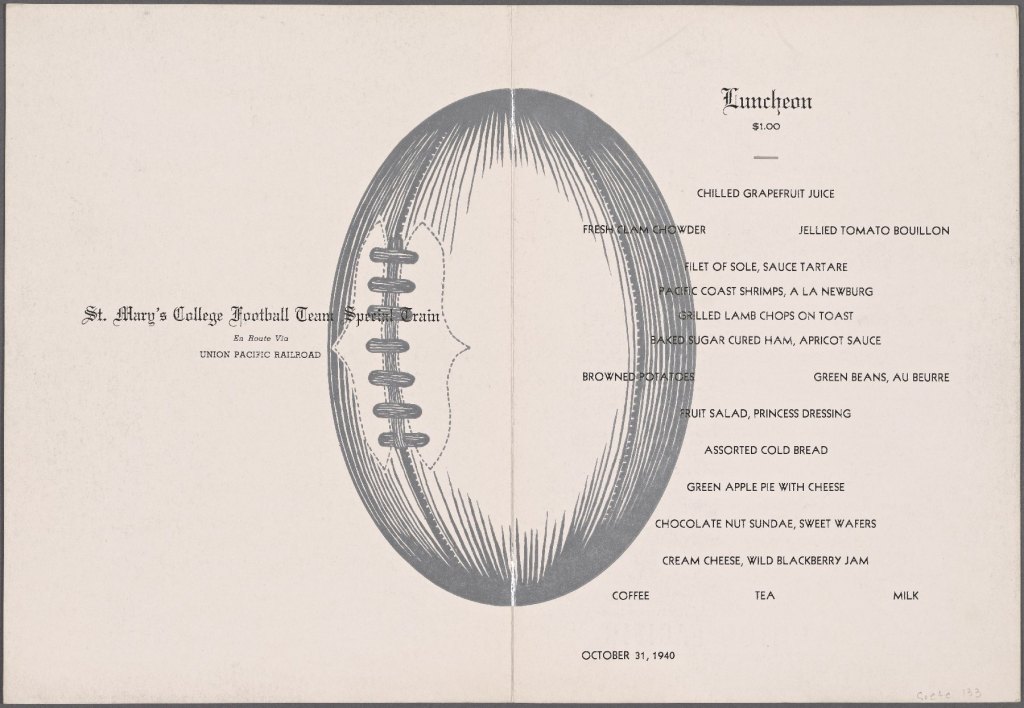 When examining the St. Mary’s College Special Football Train menu, I could not help but notice the date on the corner that read October 31, 1940. After doing some further research, during the 1940 football season, The St. Mary’s College Football team played versus Fordham in New York on October 26. Next on their schedule came Portland, which was to be played in Portland on November 3. This meant that the St. Mary’s College football team had to travel from New York to Portland, Oregon in order to play their next opponent.