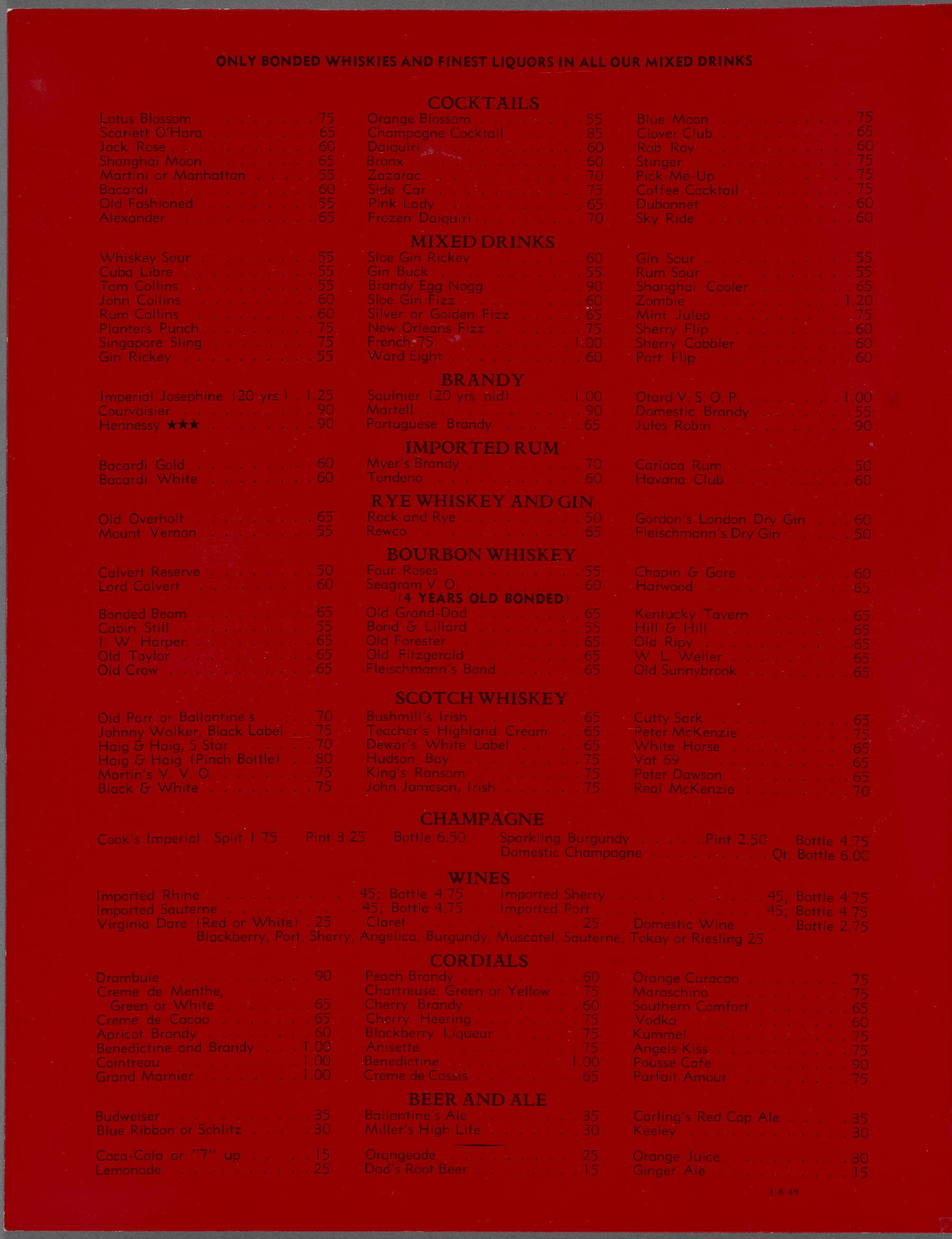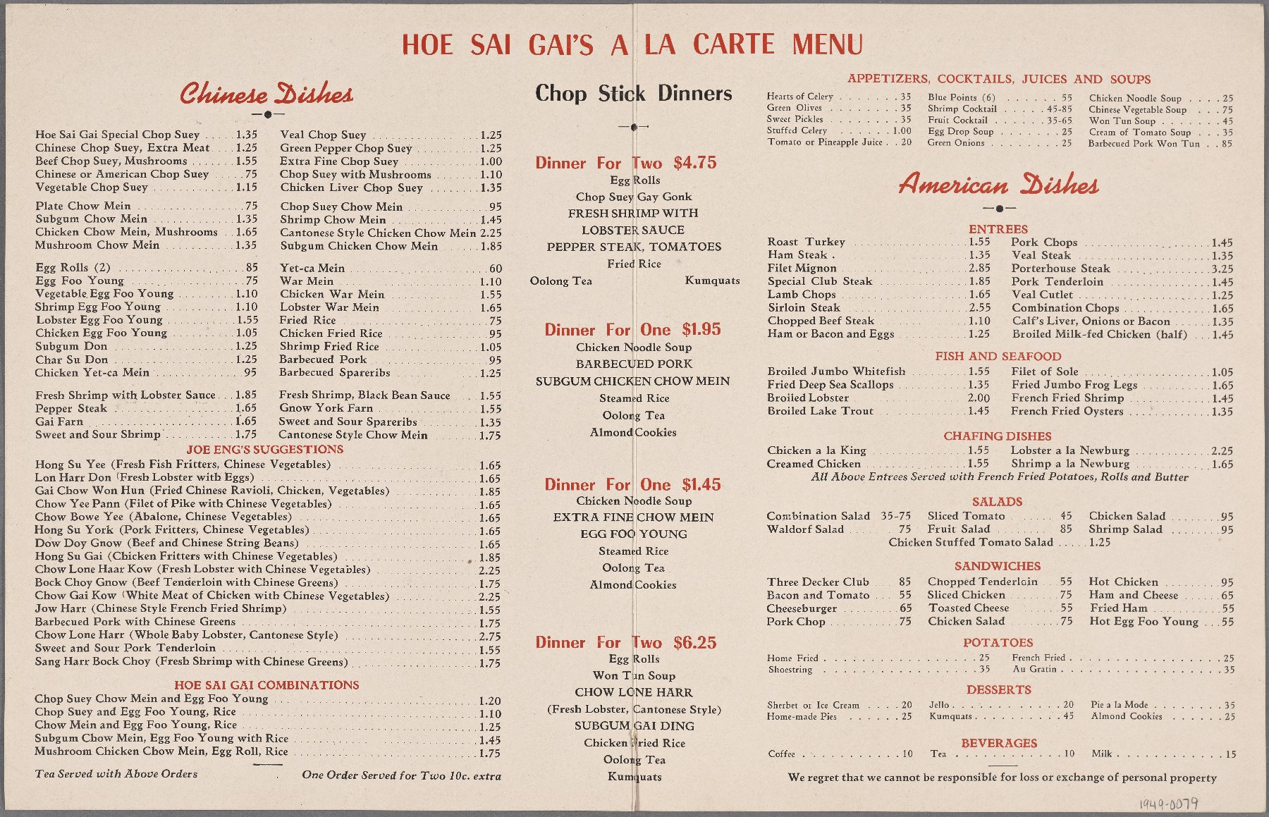 What is interesting to note is that this menu points still falls under the array of Chinese restaurants that remained less expensive than non-Chinese, mid- to upper-scale restaurants. Hoe Sai Gai may have been one of the more expensive Chinese restaurants, but the expensive, non-Chinese dishes offered — such as lobster and filet mignon — remained much cheaper than they would have been had a patron gone to an upper-class French restaurant. The most expensive Chinese dish offered on this menu was Chow Lone Harr, a whole baby lobster cooked Cantonese style, at the cost of $2.75. The most expensive American dish offered on the menu was Porterhouse Steak at the cost of $3.25; only 50¢ more than the most expensive Chinese dish.