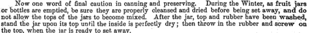 The way Witherspoon describes canning is extremely similar to the Appert canning method. “Just before the time is ended, place the jars in water as hot as the glass will stand without cracking; drain them and at once adjust the rubbers…fill it to overflowing. As the jam runs out of the top, screw down the metal cover tightly. Use the wrench that comes for this purpose, as the top can thus be made perfectly tight…set away to cool. After they are cold, tighten the tops a little more… Jam made in this way may be kept for an indefinite period”. She emphasizes the tightening of the lids, “On the following day, when the jars are perfectly cold, tighten the tops more if possible” which, again, is essential for successful preservation. She also recommends avoiding shaking the jars once they are cooled to prevent the fermentation of the fruit, something that Appert never mentioned. It is true however, as shaking the jars increases the probability that gas will be produced inside the container, causing fermentation to occur. Witherspoon mentions something else that is interesting and accurate, “Canned fruit should always be opened two or three hours before it is needed, as the flavor is much finer when the oxygen, of which it has been so long deprived, is thus fully restored”. Although Appert does not consider this, it makes perfect sense that jams and marmalades would taste better after being left out for a while. She goes as far as to describe in detail how to best care for the glass jars: