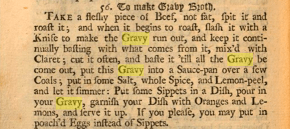 Nott, J. (1724). The cooks and confectioners dictionary: Or, the accomplish’d Housewife’s companion. Google Books. Printed for C. Rivington. Retrieved December 3, 2022, from https://books.google.ca/books?hl=en&lr=&id=w_dAAQAAMAAJ&oi=fnd&pg=IA1&dq=Cooks+and+Confectioners+Dictionary&ots=5c50Yuk_xK&sig=oOVQbHR6hu0P7I71pwTHh5Ez2ls#v=onepage&q=gravy&f=false.