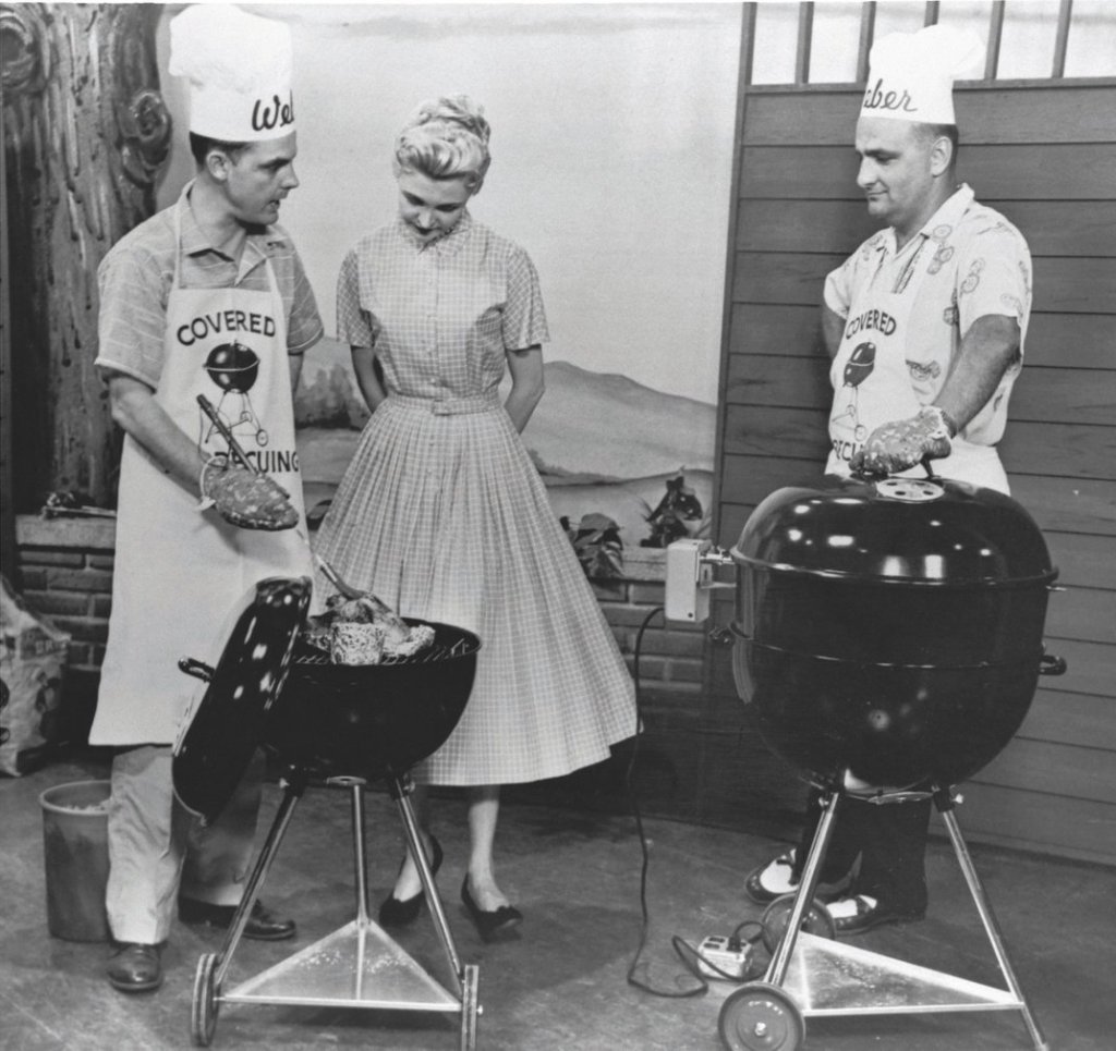 The most important piece of any grill-out is, of course, the grill. Weber Brothers Metal Works, founded in 1887 produced a range of metal products, from hinges to wagons. In the 1950s, George Stephen, Sr. worked in sales at Weber Brothers Metal Works, which his father ran at the time. He often worked on fabricating and selling innovative products, including mailboxes, fireplace equipment, and metal buoys for both the Coast Guard and the Chicago Yacht Club. However, being a family man with twelve children, George knew that “one of the best ways to bring families together was through a shared meal enjoyed in the great outdoors,” as quoted by his son. At the time the most common grills were open charcoal braziers. The issue with brazier grills was that there was no covering so weather such as rain and snow made them useless, they only had a single heat and no control, and even in clear skies many people had issues with the wind blowing ash everywhere. In 1952 George decided to make his own grill by taking two half spheres of a buoy and putting them together to make a grill. His first attempt did not work because the fire very quickly went out, so he decided to use his tools and put some holes in it for air. After adding features such as adjustable vents for snuffing out flames after cooking, Stephen marketed this first grill as “George’s Barbecue Kettle.” It sold for $29.95, or the equivalent of around $270 today. In the mid 1950’s George had to split his business from his father’s and venture out on his own, and after a few successful years he bought out his father’s partner and changed the name of the company to “Weber-Stephen.” Advertisements would often portray the kettle grills next to ads for live demonstrations and the chance to try out what food tasted like from a weber grill.