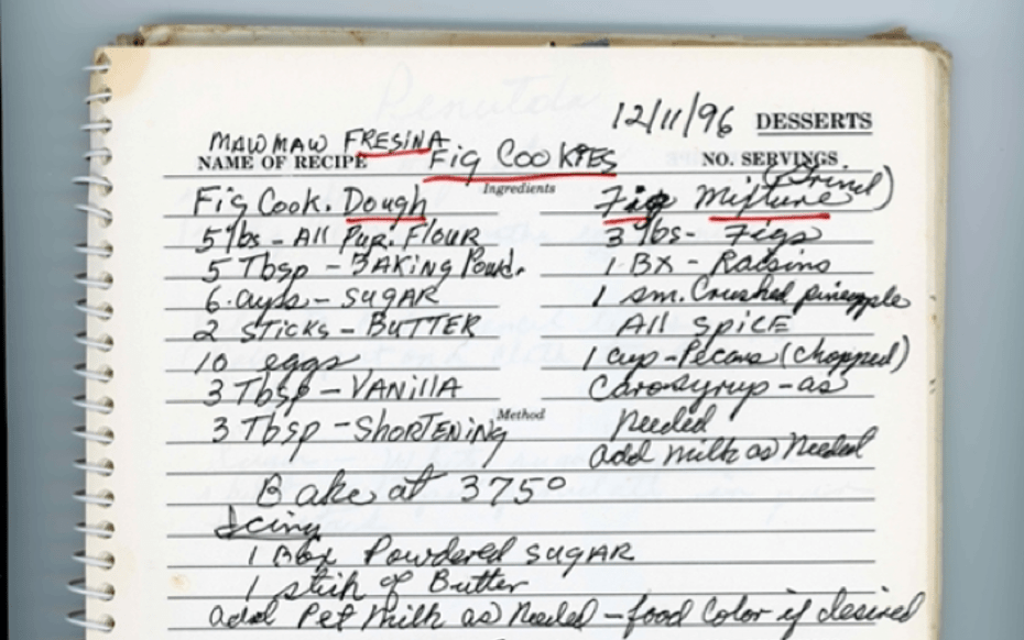 It is not particularly surprising that a recipe passed down through generations would come with few actual instructions. Recipes such as these are primarily meant to be an ingredients inventory, whereas the methods involved in making these fig cookies would have passed down orally. Every Italian family has their own iteration of how this cookie is made, typically pertaining to what was available to the immigrant families in the late 1800s and early 1900s. It was in this time period where canned fruits and vegetables started becoming readily available and affordable. In this recipe, crushed pineapple is used, but it is also very common to see lemons or oranges used instead. Other recipes call for almonds or walnuts rather than pecans, but pecans were much more common in the United States than almonds or walnuts, which are more European and Mediterranean options.