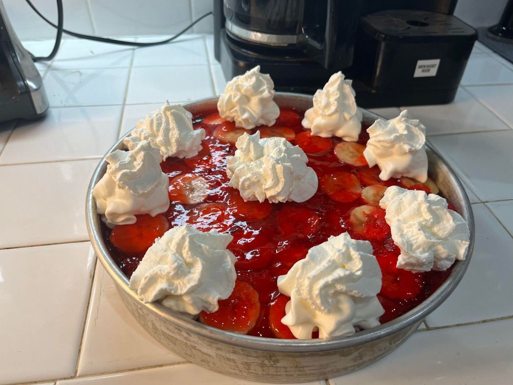 For this project, I knew I had to make at least one of these pizzas. I am not one for seafood – especially clams and anchovies – which left the banana gelatin dessert pizza. The recipe calls for yellow cake mix, an egg, water, fruit flavored Jell-O mix, whipped cream, and about 3-5 bananas. You first begin by mashing a banana and mixing it in with the yellow cake mix, water, and an egg to make a banana flavored cake batter. After baking, I let it cool and began to work on the Jell-O. For this, I chose strawberry flavored Jell-O because I thought it would compliment the banana flavor of the cake mix. I then sliced a couple bananas and spread them across the cake and poured the slightly set Jell-O on top. After everything had set properly, I topped it off with whipped cream. Overall, this dish was extremely easy to make with the simple steps. This dish does take some time to make because of the need for it to set and cool, but you can always do other activities while everything sets into place. One issue I did run into is how thick the cake part of the pizza came out. The recipe calls for a thirteen inch pan, but I only have a ten inch pan available to me. Because I still used the regular amount of cake mix, the cake came out thicker than expected and caused the entire dish to become more like a cake with Jell-O in place of the frosting rather than a pizza. I was very skeptical of how this would taste, but it was actually very flavorful and left me and my family wanting more; almost the entire dish was eaten in one night. I feel as though the strawberry gelatin overpowered the banana flavor, but I also neglected to top the gelatin with more banana because I was so excited to eat it. The cleaning of this dish was also very easy and convenient.