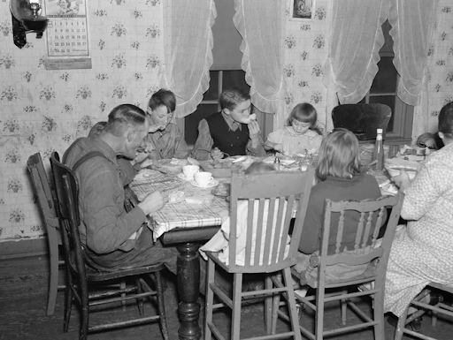 “Tip Estes of Fowler, Ind. and family eating dinner in 1937.” Image. Library of Congress; the