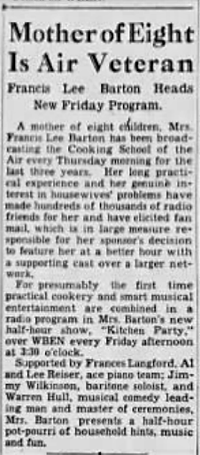 These images show the General Foods air, or radio, show about cooking, using Frances Lee Barton’s voice and kitchen expertise to help women manage their kitchen and to cook better and more efficiently. Now, you may be asking who Frances Lee Barton is, and what credibility she has. In the newspaper clipping titled, “Mother of Eight Is Air Veteran,” it describes the same Frances Lee Barton from the General Foods radio show– “Cooking School of the Air,” as a mother of eight children, and talks a bit about her three year career on the air, as well as her years of being a housewife that was interested in hearing about other housewives’ problems: cooking, managing time with work, children, and kitchen duties.