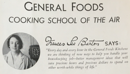 In the next newspaper clipping from decades later, it mentions a woman named Marie Sellers, director of the consumer service department of General Foods Corporation, is retiring. It is revealed that this Miss Sellers was, “the official Frances Lee Barton… one of her many responsibilities has been directing the daily Cooking School of the Air program” (Meade pg 25). So this whole time, the famous housewife, Frances Lee Barton, was a persona for the air and publicity of General Foods. This begs the question as to why they invented this whole character of a mother of eight, rather than just having Miss Sellers herself as the voice and face of this project.