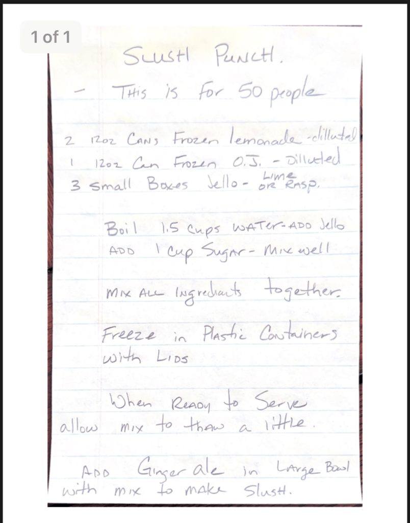 Christmas Eve in the Loney household has always been a sight to behold. Hundreds of string lights line the roof, twinkling against the white winter snow. Inside, my father’s pumpkin rolls waiting to be cut, the Christmas ham cooking in the oven, and heaps of sweets in brightly colored bowls set about the room. On the counter beside the vegetable tray sits a huge bowl full of neon green punch. Does that sound gross? Well, it kind of is; in that punch bowl is Great-Grandma Armstrong’s “Slush Punch.” The recipe has been in the Loney family for about 60 years now, beginning when my Great-Great Aunt first got the recipe from one of the cooks at Lubbock Christian University in Texas. I imagine that the cooks used the recipe because it supposedly has 50 servings per batch, perfect for serving a large group of college students. My Grandmother told me that she doesn’t remember the exact time her mother got the recipe, but that it’s been around since she was very young. Below I have an image of the recipe as it is written in a family cookbook.