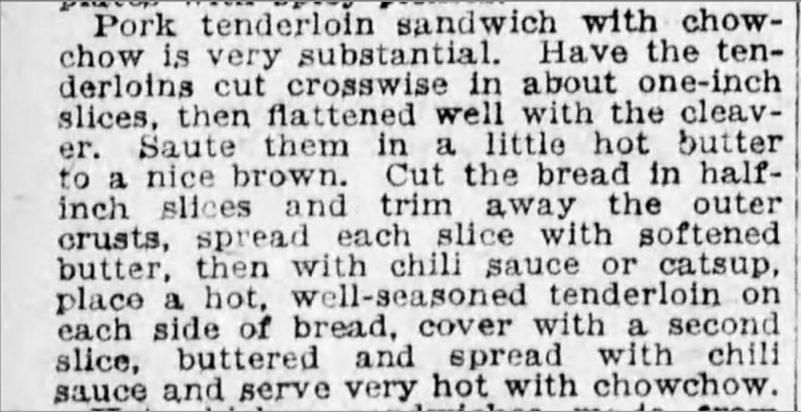 The advertisement above describes how to prepare the pork in the sandwich with another ingredient, chow-chow. Pork tenderloin sandwiches can be made in an abundance of ways so the addition of chow-chow will yield the same results of how to prepare the sandwich. For the advertisement’s example, one would cut crosswise on the pork slice and then battered it with a cleaver. Then one would fry it quickly or saute them in butter until it showed a brown color. This method is different from Freinstein’s as he would have left them to marinate in the ingredients while the advertisement is cooking them while they are frying. The various preparation methods for the pork tenderloin sandwich gave cooks freedom to experiment with the dish in new, creative ways.
