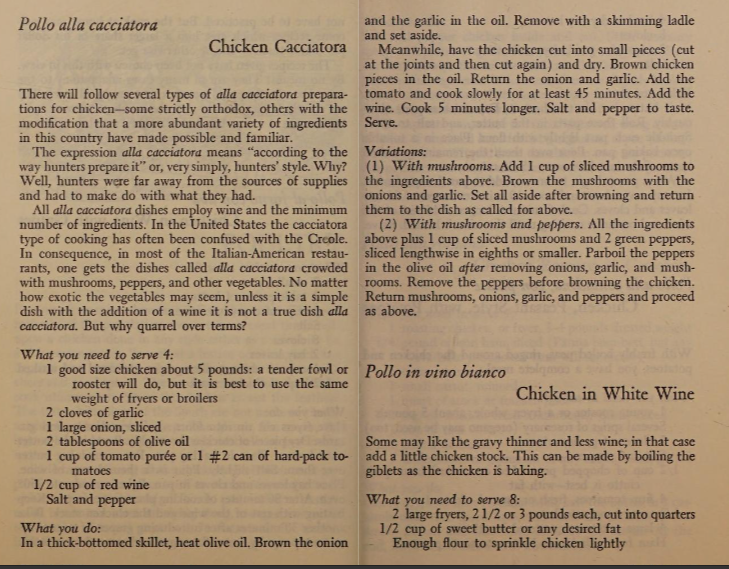 Originally a Piedmontes (northwestern Italy) cuisine, pollo al cacciatore or chicken cacciatore, was first widely introduced to the U.S. in the early 1920’s and can be seen in early ‘cookbooks’ such as “Unknown Italy ” (1927) which aims to introduce specific Italian culture to the American public. In the first chapter of the book, people of Piedmont are described as lower class and nothing like the stereotypical Italian. The book adds that, “the peasants are sober, industrious and thrifty. They have not the gay and insouciant disposition of Italians of the south but are more serious and unemotional” (Reynolds p.242). The dish is a perfect reflection of this Italian region’s people, as cacciatore translates to ‘hunter’, meaning this dish was valued for its ability to taste delicious despite what meat was available (variations include chicken, veal, rabbit, duck, goose, and salami). Also known as ‘peasant’ or ‘country-style’ chicken, the dish’s’ traditional components included garlic, onions, red wine, spices (oregano, rosemary, basil), and stewed tomatoes. Throughout the centuries, many variations (white wine cacciatore) and ingredients like mushrooms, celery, bell peppers, and black olives have been added to suit the taste buds of whoever’s dining. It was also traditionally cooked in an earthenware marmite, which was commonly owned by Italians who hunted and foraged their own food. Just like the people of Piedmontes intended, this dish served its purpose of simplicity and adaptability in times of difficulty and rationing in the ‘New World’, more specifically for Americans facing World War 2 beef rationings. To paint a better picture of this notion, let’s take a close look at a recipe by 1950’s Garibaldi Marto Lapolla, who paved the way for future Italian American authors that struggled to accurately write about the topics of acculturation and adapting to the processes of American cooking. Although his work titled; “Italian Cooking for the American Kitchen”, published in 1953, follows a more Southern Italian/ Sicilian approach, the chicken cacciatore recipe (page 136-137) is very similar to 1920’s descriptions and even offers amusing explanations to the different variations of the dish. He even attributes American restaurant’s confusion of cacciatore style cooking with Creole cooking, hence the addition of copious amounts of ‘exotic’ vegetables and the “holy trinity” of bell peppers, celery, and onions. In reality, this simple, yet flavorful recipe has always been valued for its convenience, elegance, and enhancement of a variety of ingredients, yet requiring key Italian components like tomatoes, garlic, and red wine.