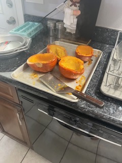 My first step was cutting the sugar pie pumpkins I bought in half and scooping the insides out. I cooked the pumpkins in the oven at 350 degrees for one hour. Once the pumpkins were done baking, they were soft, and I carved out the inside of the pumpkins and put 1 pint of pumpkin into a bowl.